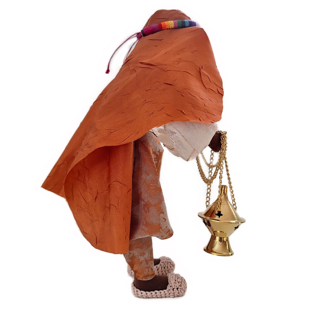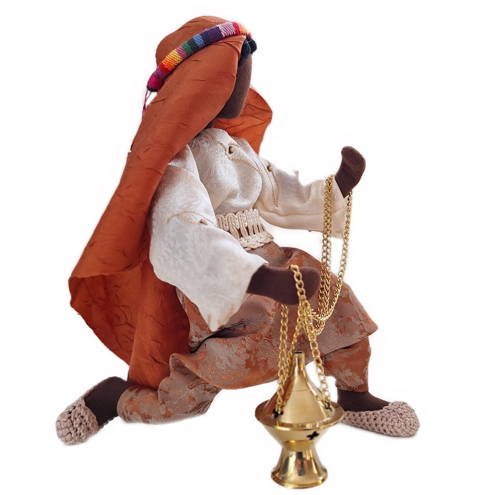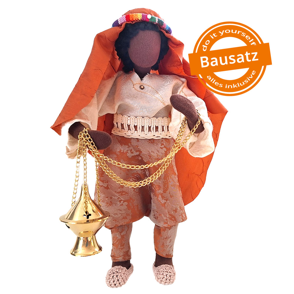 Unser aus Afrika stammender König trägt seine edle Landestracht mit Pumphose und handgehäkelte Schuhe. Die erhältst du zusammen mit dem Arbeitsmaterial und dem goldenen Weihrauchschwenker als Bausatz, um Melchior in Eigenleistung herstellen zu können.