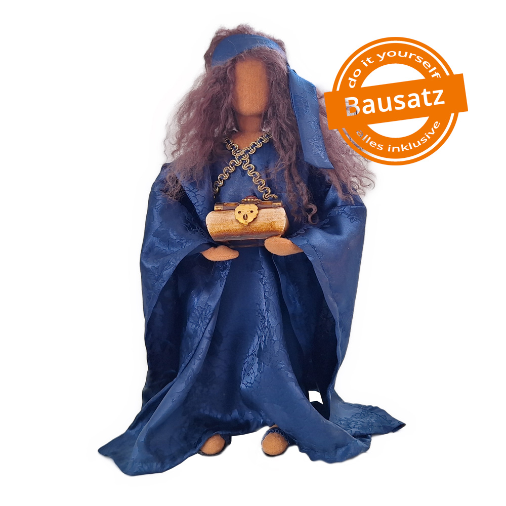 Du erhältst den Bausatz, um den in blau gehaltenen König Balthasar aus Asien herstellen zu können. Dieser beinhaltet das Arbeitsmaterial sowie Kleidung, Schuhe und ein blaues Haarband sowie die schöne Schatztruhe aus Horn, gefüllt mit Goldnuggets.. Wenn du die Krone haben möchtest, kannst du sie dazu bestellen.