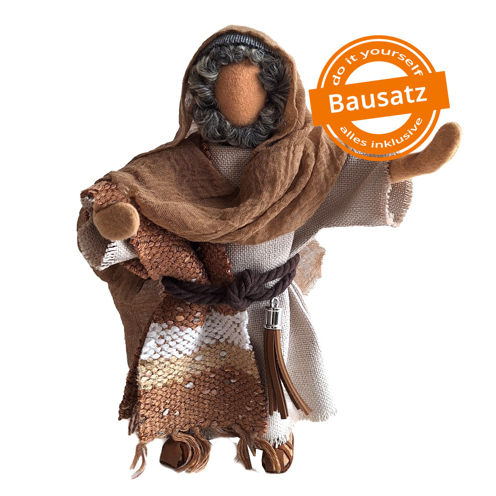 Du erhältst das Arbeitsmaterial, um Daniel in Eigenleistung herstellen zu können. Daniel war als Berater des Königs Darius ein wohlhabender, begüteter Mann, und so trägt er edle Kleidung, die ebenso wie die Schuhe Teil des Bausatzes ist.