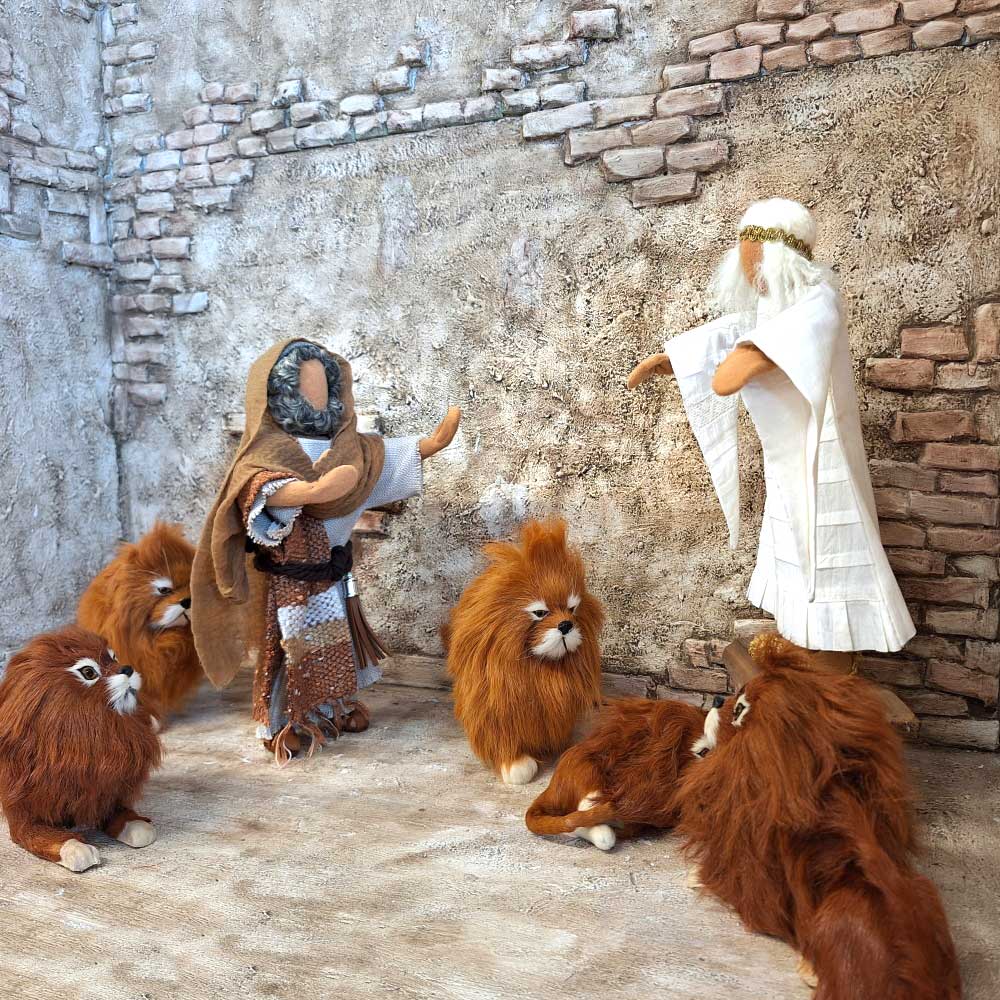 Der König lässt Daniel in eine Grube voller wilder Löwen werfen, weil dieser nicht aufhören will, Gott anstatt des Königs anzubeten. Doch der von Gott gesandte Engel zähmt die Löwen und so bleibt Daniel völlig unbeschadet.