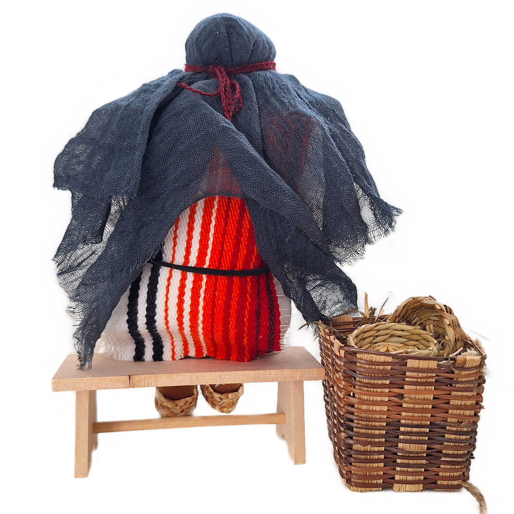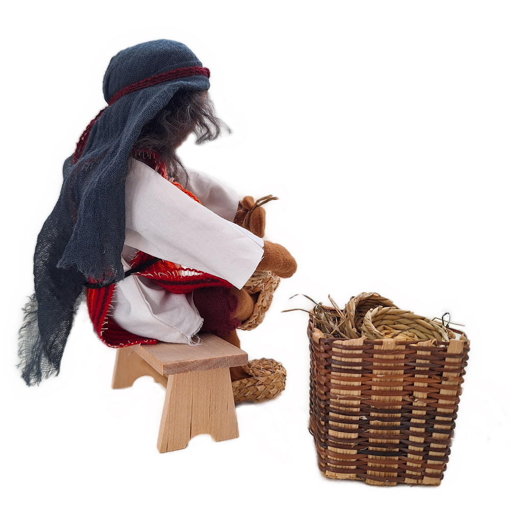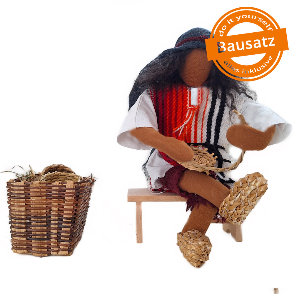Du erhältst das Arbeitsmaterial, um den kleinen Korbflechter in Eigenleistung erstellen zu können. Die freundliche Figur ist 25cm groß, ein Teenager also, und er ist ein sehr fleißiger junger Mann. Er flechtet gerade einen Korb und ist schon fast fertig damit. Zwei weitere Körbe hat er schon fertig gemacht. Sie liegen in einem großen eckigen Korb. Alle diese Zubehörteile sowie die Sitzbank sind im Bausatz inbegriffen.
