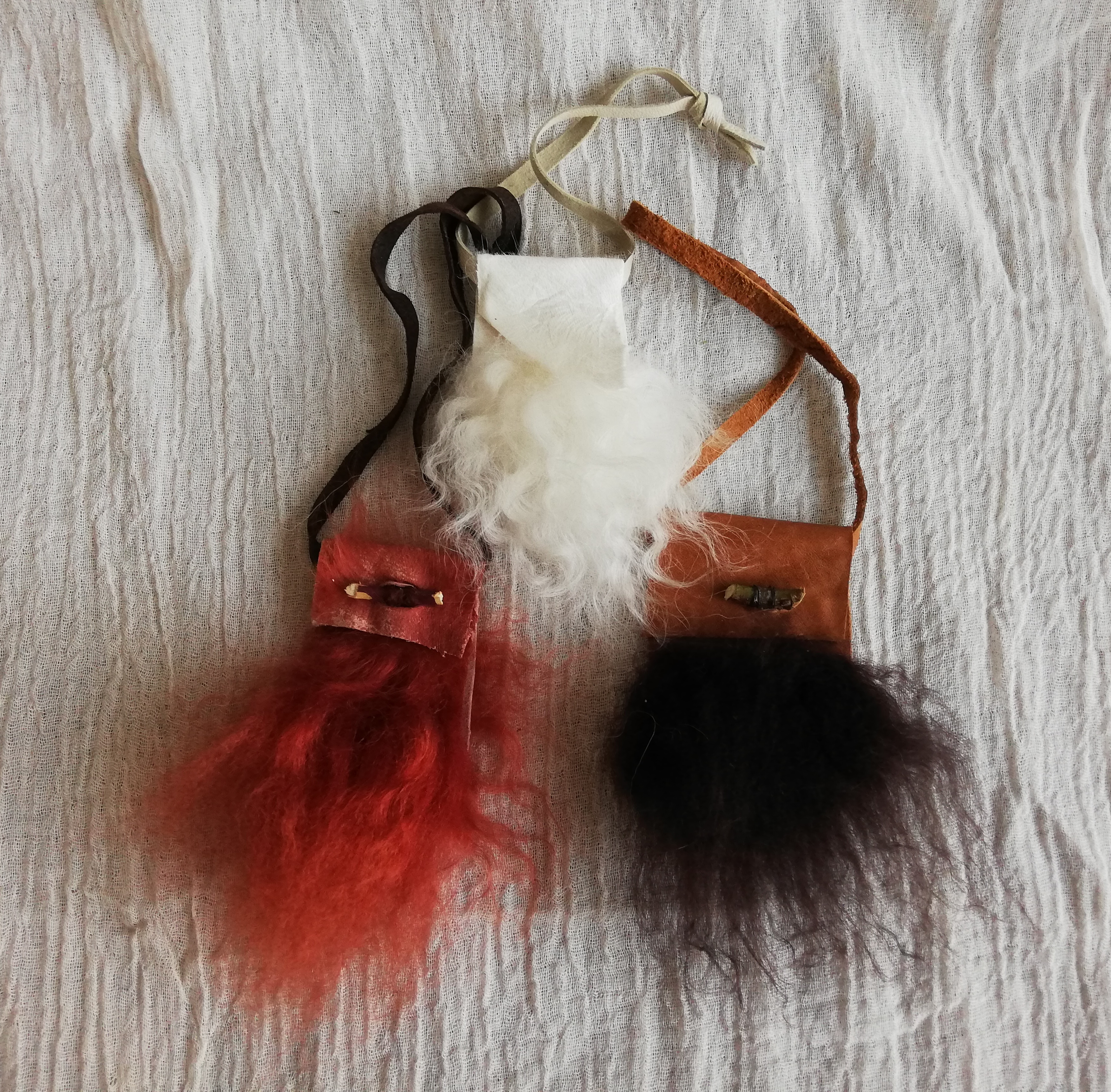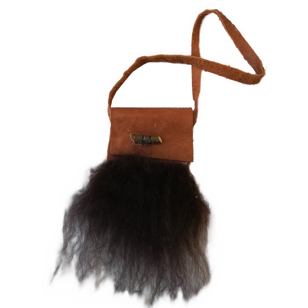 Allen gemein ist, dass sie eine Kombination aus Leder und Fell sind, real gefüllt werden können und mit einer Schließe aus Naturmaterial verziert sind. Alles reine Handarbeit!