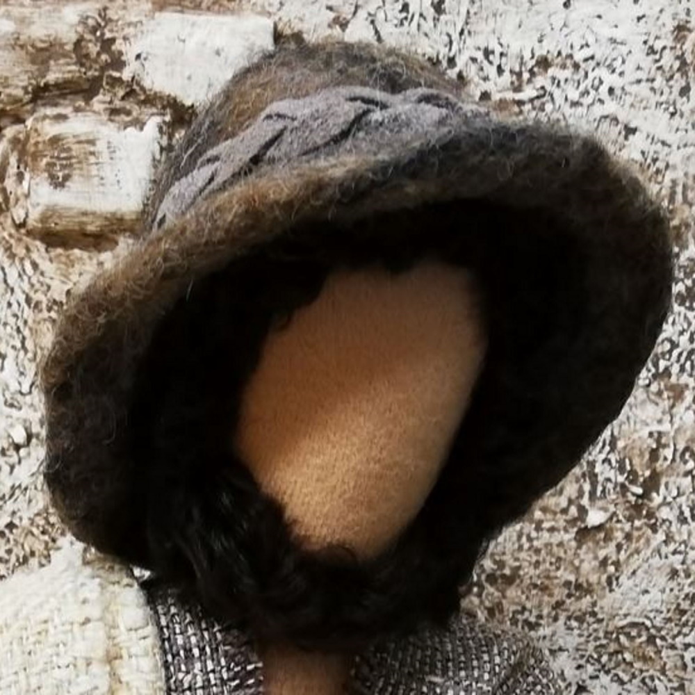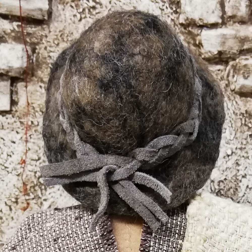 Der handgefilzter Hut passt auf Figurenköpfe von 25-30cm großen Erzählfiguren. Jeder, der schon einmal ein Werkstück gefilzt hat weiß, wie aufwändig es ist, so einen stabilen, perfekten Hut zu filzen. Der Hut hat ein schön gezopftes Hutband aus Leder.