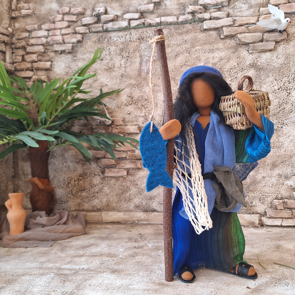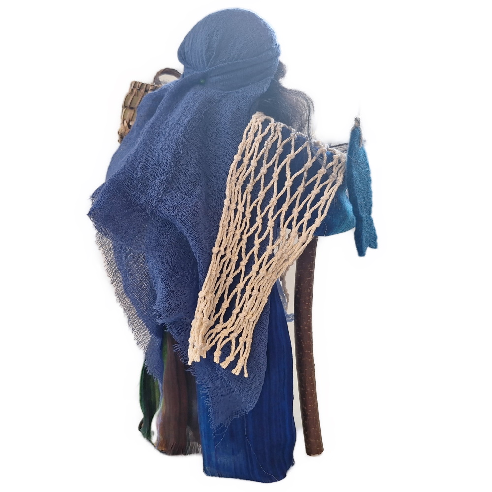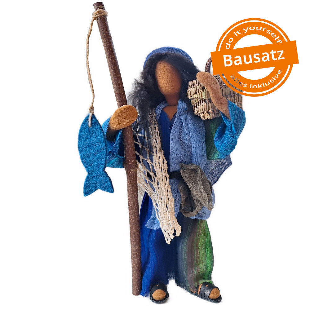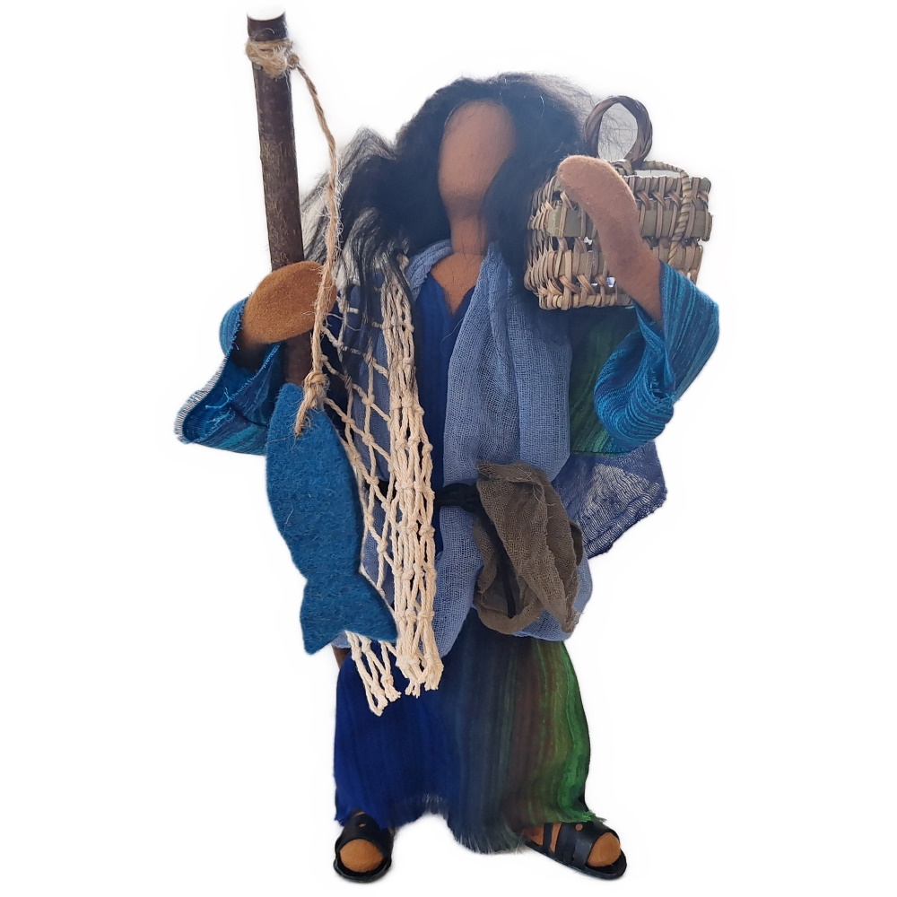 Petrus verdient seinen Lebensunterhalt als Fischer. Mit seinem Bruder Andreas sowie Philippus, Johannes und Jakobus arbeitet er am See Genezareth. Gemeinsam werden sie zu Aposteln und zu Menschenfischern.Petrus hat ein sehr schönes Gewand mit einem ganz speziellen Gürtel. Er hat zwei Fische dabei, einen Korb und ein umgehängtes Netz. Dieses Netz ist nur zur Dekoration gedacht, denn ein richtiges Fischernetz hat Korken und Schwimmer. Wir haben ein schönes angefertigt, in dem sich auch zahlreiche Fische tummeln. Du kannst es gerne dazu bestellen.
