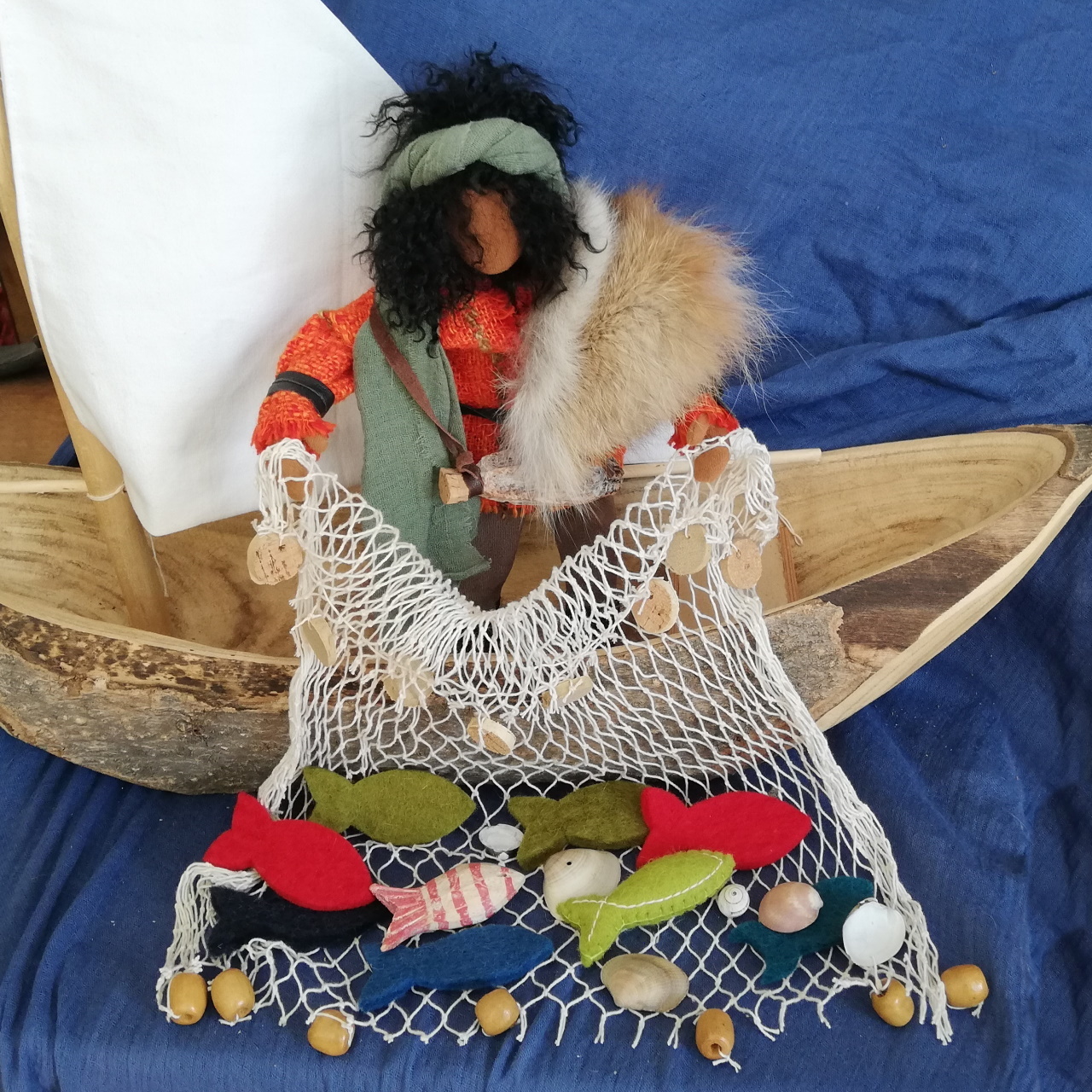 Unsere Fischerfiguren haben Netze umgehängt, die sind aber mehr als Deko gedacht. Zur Veranschaulichung der Fischerei zu Zeiten Jesu sind sie jedoch nicht tauglich. Da wird dieses Netz mit den vielen schönen Fischen den Kindern Freude machen!