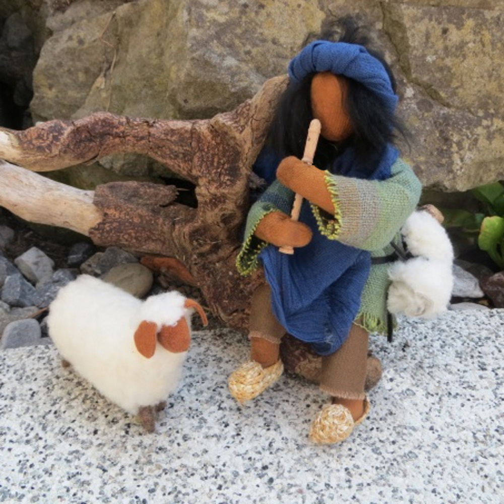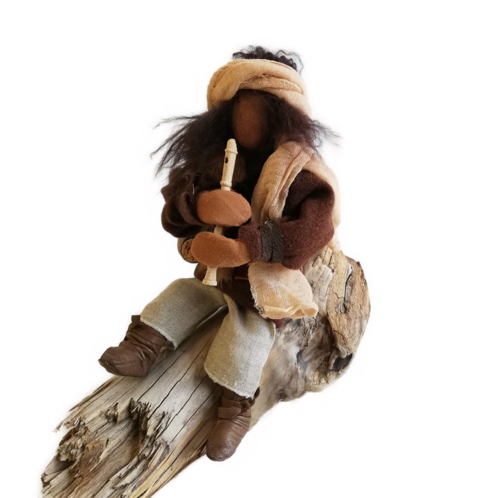 Der jugendliche Flötenspieler - 25cm hoch - sitzt ganz in seine Musik vertieft auf einer Wurzel. Er spielt ein Lied, um seine Schafe zu beruhigen, damit sie ganz in seiner Nähe bleiben. An Weihnachten darf er mit zur Krippe, um dem Jesuskind seine schönste Weise darzubringen. Wenn er gerade nicht auf der Flöte spielt, kann er natürlich auch aufstehen und für Szenen mit Kindern eine Rolle übernehmen.Die Wurzeln sammeln wir am Bodensee. Es liegt in der Natur der Sache, dass jede anders aussieht.