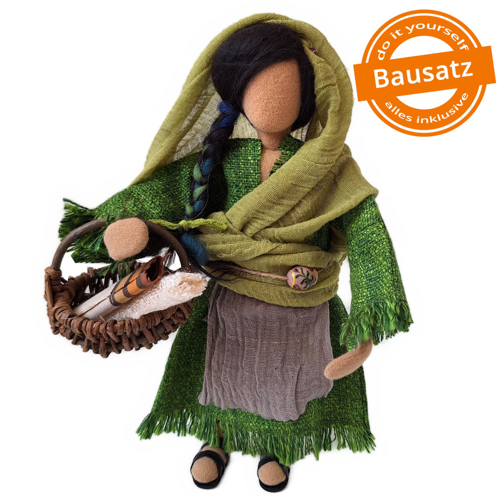 Die Geschichte Rut erzählt vom Fremd sein und Heimisch werden. Sie reist mit ihrer Schwiegermutter Noomi - beide verwitwet - nach Bethlehem, wo sie Boas kennen lernt. Beide Frauen bemühen sich, dass er Rut heiratet, denn nur so sind sie sicher und auf Dauer überlebensfähig.Unsere Rut trägt ein bequemes Reisekleid mit großem Schleiertuch, um sich für die Reise gut bedecken zu können. Sie hat drei Körbe mit dabei, in denen sie ihre Habseligkeiten verstauen kann.