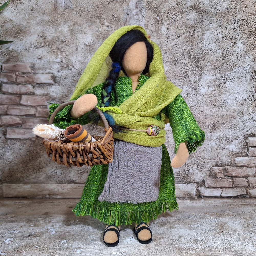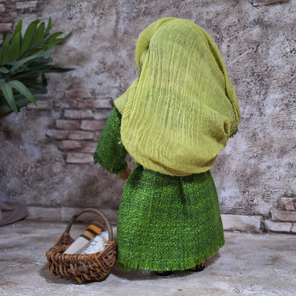 Produktinformationen "Frau grünes Kleid Schuhe Korb mit Stoffrollen"