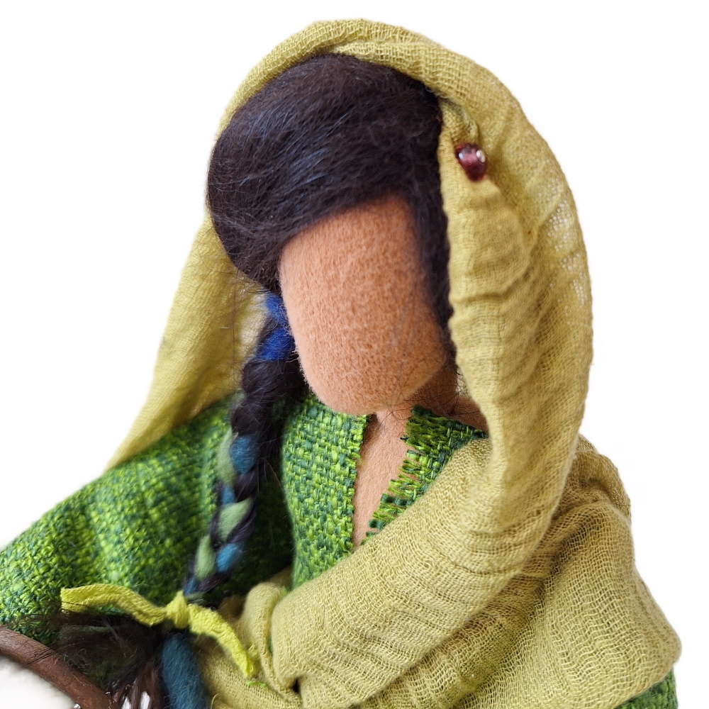 Deborah ist wie Lydia eine der ganz, ganz wenigen Frauen, die zur Zeit Jesu ein wichtiges Amt inne hatten und die Möglichkeit, über die Geschicke ihres Volkes mitzubestimmen. Sie war darüber hinaus auch Prophetin und sicherlich hat sie Wichtiges und Gutes in ihrem Leben bewirkt.Als Zeichen Ihrer Würde hält sie einen besonderen Stab aus Holz - in verschiedenen Ausführungen und sehr schön gefertigt - in der Hand.Auch trägt sie ein sehr besonderes Schmuckstück um den Hals. Es handelt sich um einen handgefertigten Anhänger mit Schmuckstein aus Pakistan. Jeder ist ein Unikat und hat eine andere Form und Farbe. Dieser Schmuckanhänger ist ein Sozialprojekt: Ich habe mit einem pakistanischen Freund ein kleines Hilfsprojekt gestartet. Er gibt jeder Frau, die ihm ein solches altes Schmuckstück bringt 7 Euro, was für dortige Verhältnisse krass überbezahlt ist. So helfen wir den Frauen, ohne ihnen ein Gefühl von Almosenverteilung zu geben, und dafür kannst du und ich Freude empfinden an der Authentizität eines jeden Anhängers.