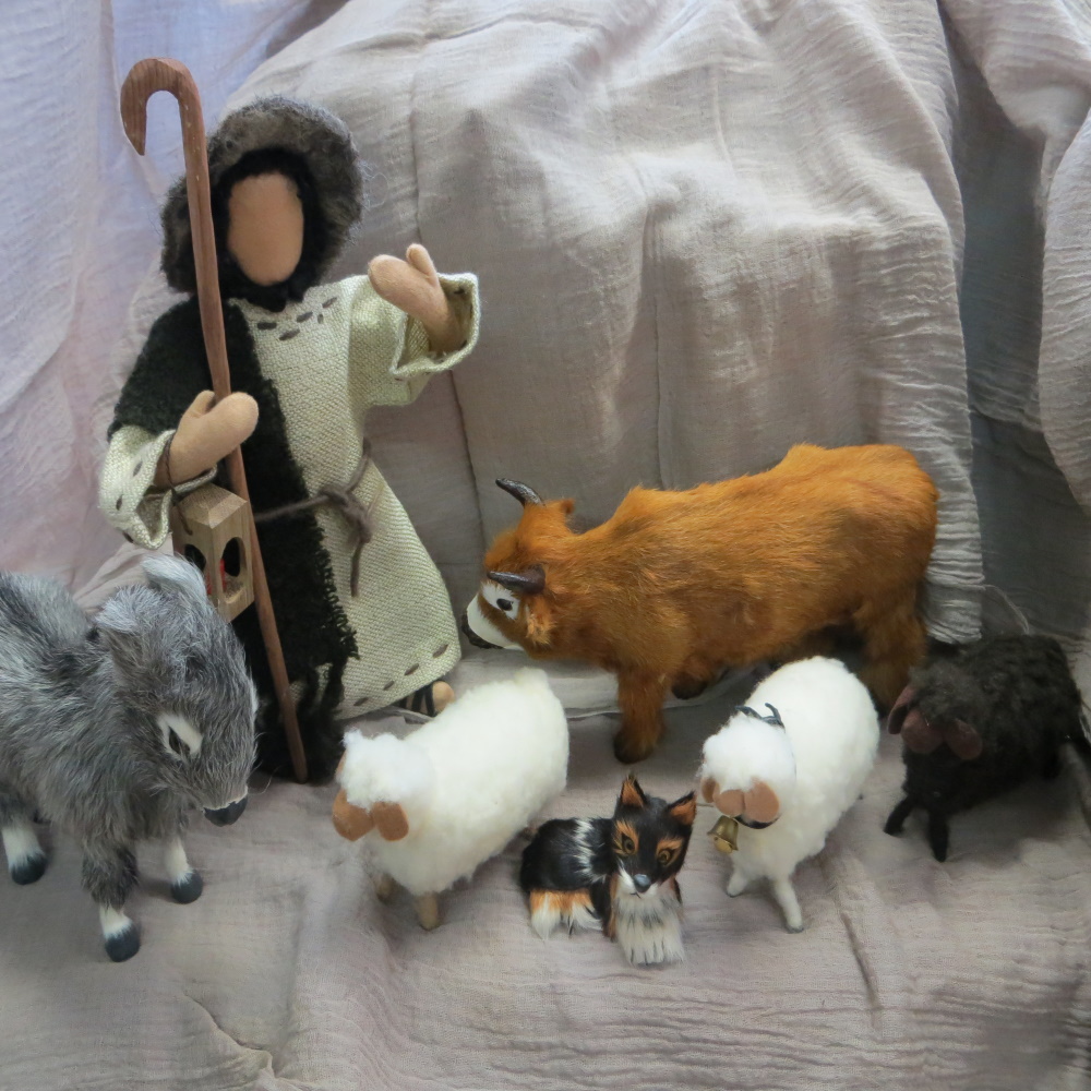 In dieser harmonischen Gruppe haben sich folgende Stalltiere zusammengefunden:* Esel stehend: 18cm hoch - 22cm lang & Satteldecke & Ledertrense* Ochse liegend: 25cm lang - 9cm hoch* Schaf: 11,5cm lang - 10,5cm hochGeschenkt dazu:* Heuballen* Stallwerkzeug nach VorratDie Tiere sind aus Rinder- Schaf- und Ziegenfell sehr detailgetreu gefertigt.