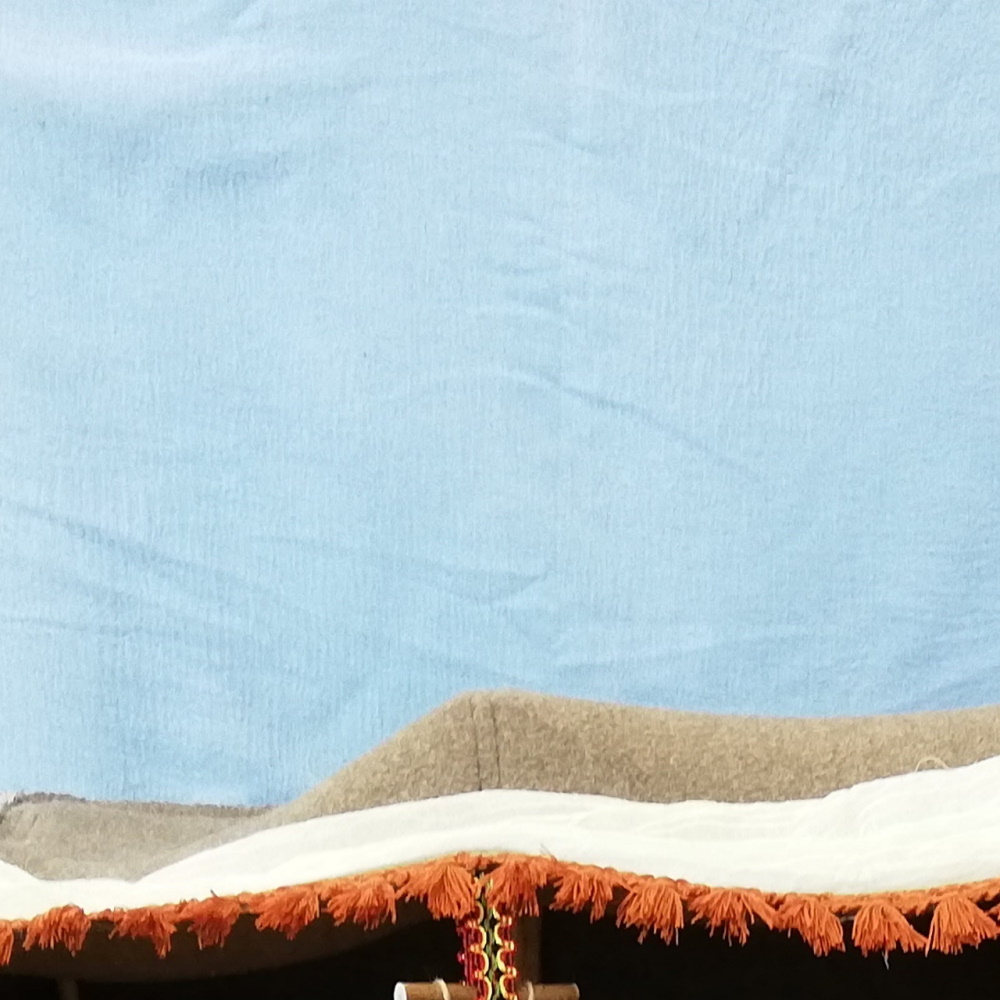 In aufwändiger Detailverliebtheit stellen wir Abrahams Nomadenzelt in unserem Atelier her. Es ist der Miniaturnachbau eines originalen Wüstenzeltes, genau abgestimmt auf 30 cm Erzählfiguren. Es ist einfach wunderschön und fasziniert Kinder wie Erwachsene gleichermaßen.In diesem Zelt steckt sehr viel Liebe und Arbeitsaufwand. Es braucht neben unseren vielfältigen Näh- und sonstigen Arbeiten auch noch die Arbeit eines Zimmermanns für die Bodenplatte, Tischlerarbeiten und einiges mehr.Das Zelt ist 80 cm breit, 40 cm tief und 37 cm hoch. Es lässt sich leicht und rasch auf- und wieder abbauen. Es wird zusammengelegt geliefert, eine Aufbauanleitung liegt bei. Die Bodenplatte ist kompakt und nicht superleicht, sie muss dem Aufbau Standfestigkeit geben. Da wir Wert auf Individualität legen, hat jedes Zelt sein Eigenleben und Sie bekommen ein einmalig zusammengestelltes Produkt. Die Zeltdächer werden aus alten Decken und alten Bordüren als Einzelstücke hergestellt. Das sieht viel authentischer aus als Neuware. Meistens sind die Dächer hellbraun, manchmal auch grün oder mit zum Thema passendem Webmuster. Wenn du ganz genaue Vorstellungen hast, rufe bitte vorher an, dann klären wir ab, was möglich ist.Neben zahlreichen Körben, Töpfen und Schalen finden Sie auch ausgefallene Dinge wie ein Fell, das gerade gegerbt wird, ein Moskitonetz für die Nacht, eine Heizstelle mit Kameldung, eine handgenähte Babywiege und vieles mehr. Entnimm das Zubehör bitte aus dem Detailbild. Die handgetöpferte Getreidemühle plus Brotbackplatte mit drei Fladenbroten und dem Tontopf mit den Getreidekörnern kannst du separat noch dazu bestellen. Wasserkrug, Gewürztopf sowie die Tonschale für das gemahlene Mehl schenken wir dir dazu. Bitte beachte, dass viele Stunden Arbeit und auch hohe Materialkosten entstehen, bis ein solches Zelt mit allem Drum und Dran in dieser Qualität geliefert werden kann. Es wird alles von inländischen Handwerkern produziert und deshalb kann ein Dumpingpreis nicht das Ziel sein. Auch die Porto-Mehrkosten sind im Preis inbegriffen.NICHT im Lieferumfang sind die auf den Fotos abgebildeten Figuren, Musikinstrumente, Tiere sowie Gazestoff zur Bodenabdeckung. Die sind alle in unserem Shop erhältlich. Du benötigst 10 halbdaumengroße Steine zur Befestigung der Zeltschnüre. Die sind zu schwer, um siemitzuliefern. Nutze gerne die Zeit, bis das Zelt eintrifft, dazu, die Steine in der Natur zu sammeln.Wir wünschen viel Freude an diesem außergewöhnlichen Figurenzubehör, welches sicher niemand mehr vergisst, der es in "Aktion" erlebt hat. Cornelia Kolb mit Team