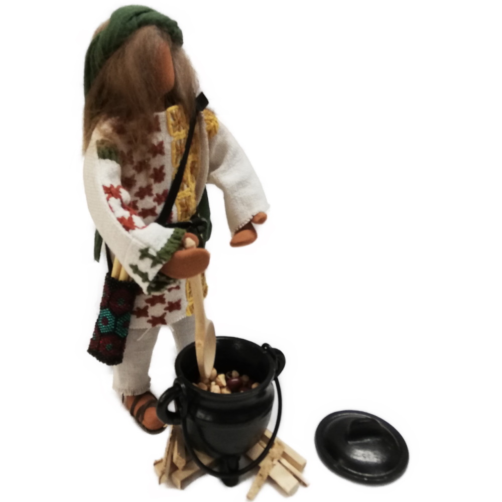 Wenn die Hirten auf dem Felde sich treffen, kochen sie sich ein gutes Süppchen in diesem schweren, gußeisenen Topf aus sehr wertigem Material. Wir haben Holzscheite zum Anfeuern, Erbsen und Bohnen für die Suppe und einen Holzlöffel beigelegt.