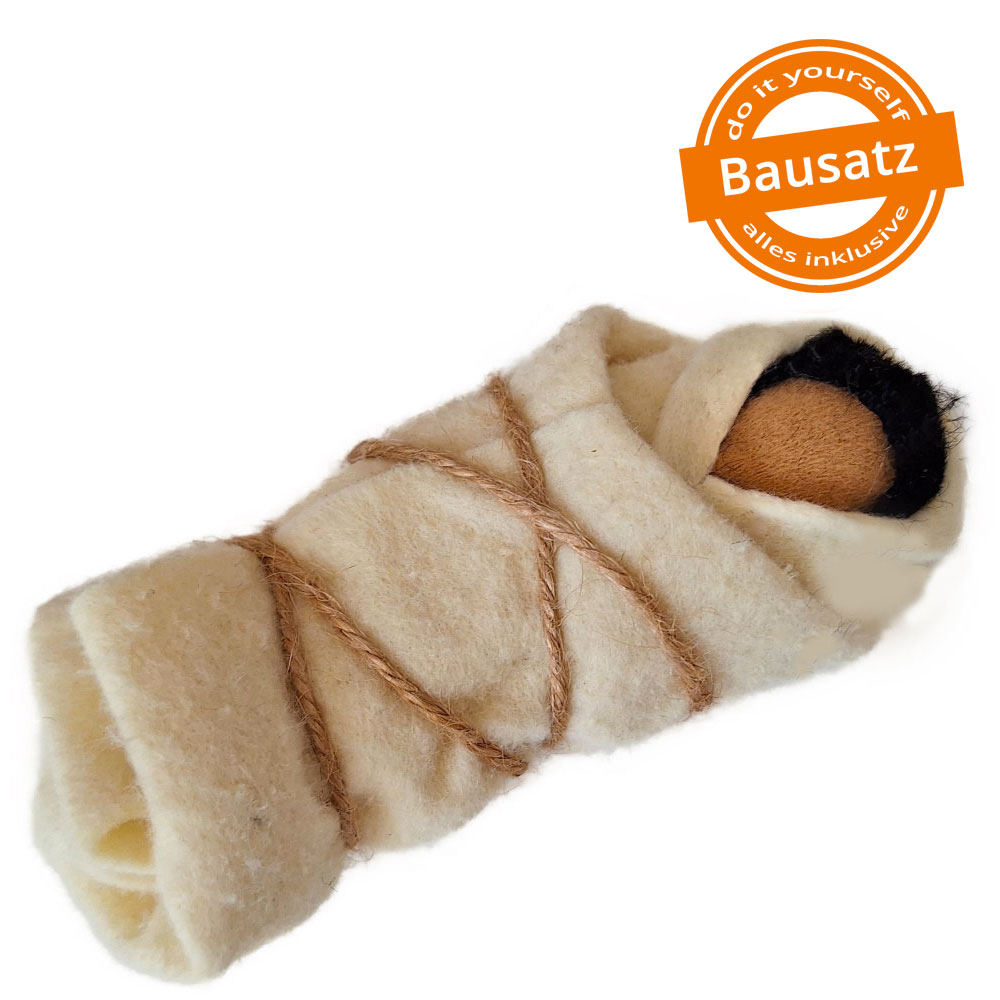 Das Jesuskind liegt friedlich in der Krippe und streckt die Ärmchen in die Höhe. Wenn es schläft, liegen die Ärmchen flach. Das Kind ist fix in seine Windel eingenäht. Die Krippe ist aus Holz, das Heu liefern wir mit.Länge Jesuskind: 11cmMaße der Krippe: 13cm lang - 9cm breit - 7cm lang