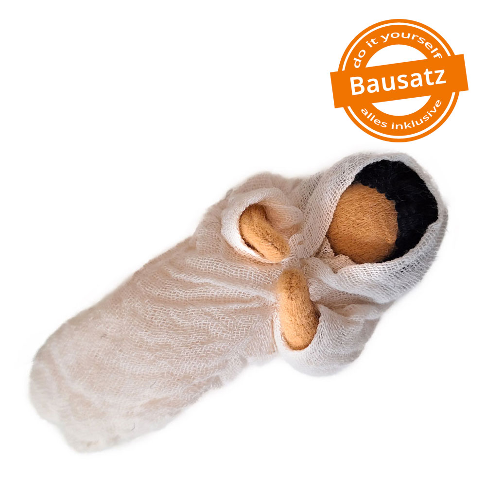 Das Jesuskind liegt friedlich in der Krippe und streckt die Ärmchen in die Höhe. Wenn es schläft, liegen die Ärmchen flach. Das Kind ist fix in seine Windel eingenäht. Die Krippe ist aus Holz, das Heu liefern wir mit.Länge Jesuskind: 11cmMaße der Krippe: 13cm lang - 9cm breit - 7cm lang