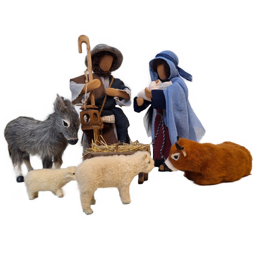 In dieser harmonischen Gruppe haben sich folgende Stalltiere zusammengefunden:* Esel stehend: 18cm hoch - 22cm lang & Satteldecke & Ledertrense* Ochse liegend: 25cm lang - 9cm hoch* Schaf: 11,5cm lang - 10,5cm hochGeschenkt dazu:* Heuballen* Stallwerkzeug nach VorratDie Tiere sind aus Rinder- Schaf- und Ziegenfell sehr detailgetreu gefertigt.
