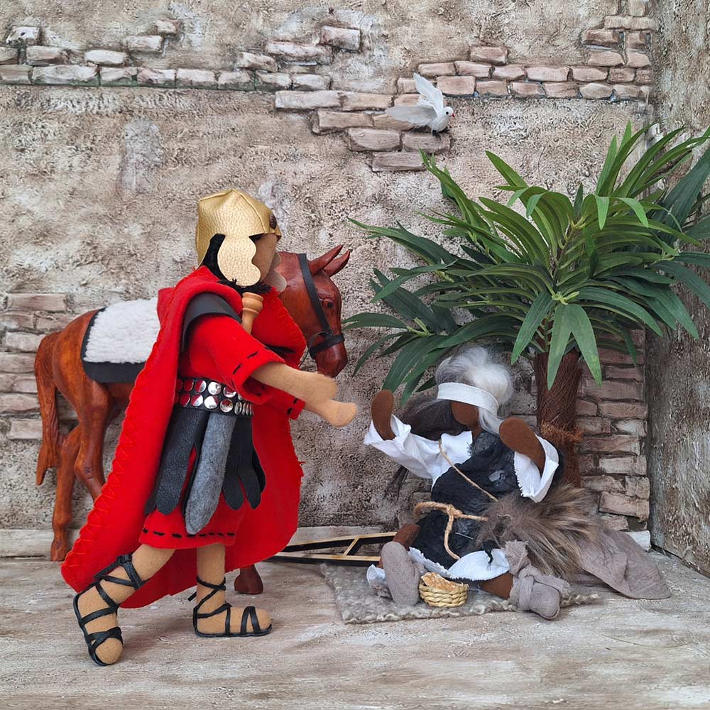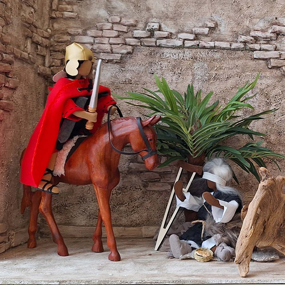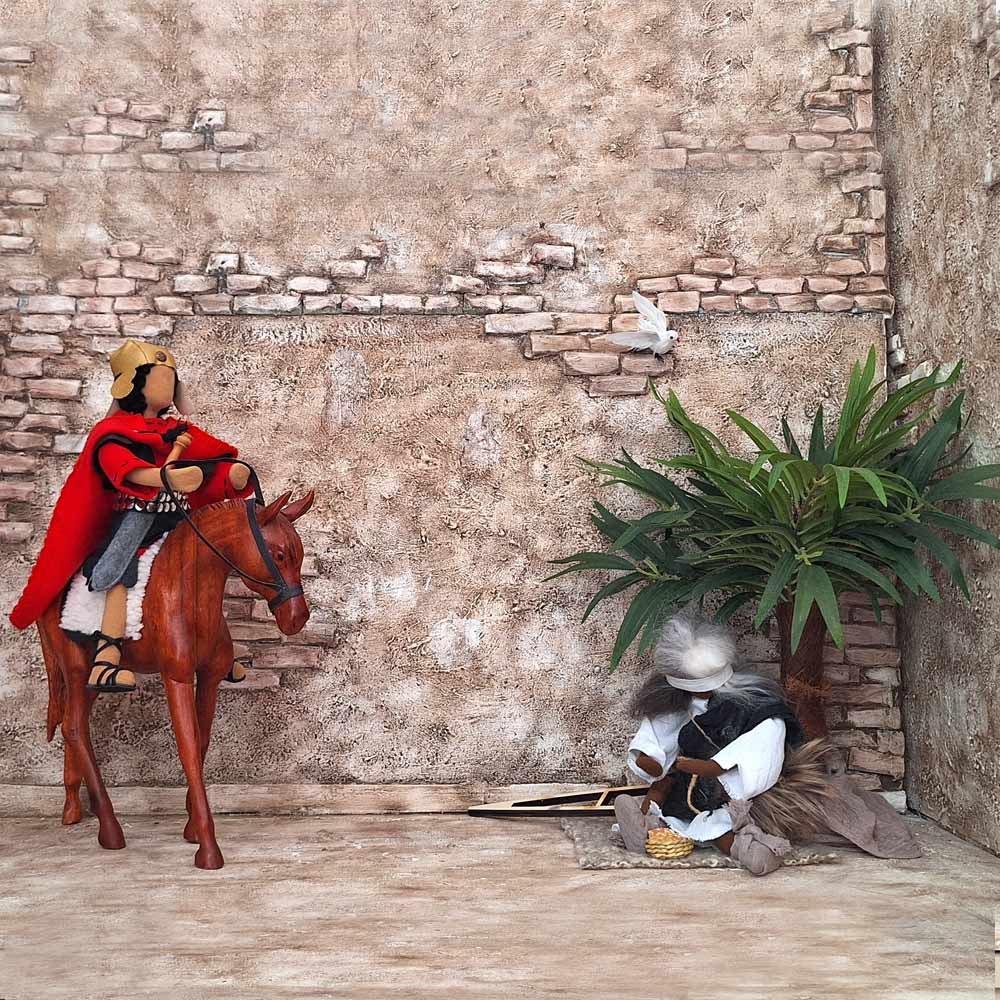 St. Martin trifft auf den Bettler, der frierend am Wegrand auf einer Decke sitzt. Er steigt vom Pferd und teilt seinen Mantel mit ihm.Barthimäus trägt ein sehr abgetragenes Kleid - in immer etwas veränderten Ausführungen - und eine Augenbinde. Seine Füße sind in Lumpen gewickelt. Eine Brotschale mit einem selbstgebackenen Brot hat er dabei. Ebenso eine Decke und eine Sitzunterlage. Die Krücke können Sie optional dazu bestellen.