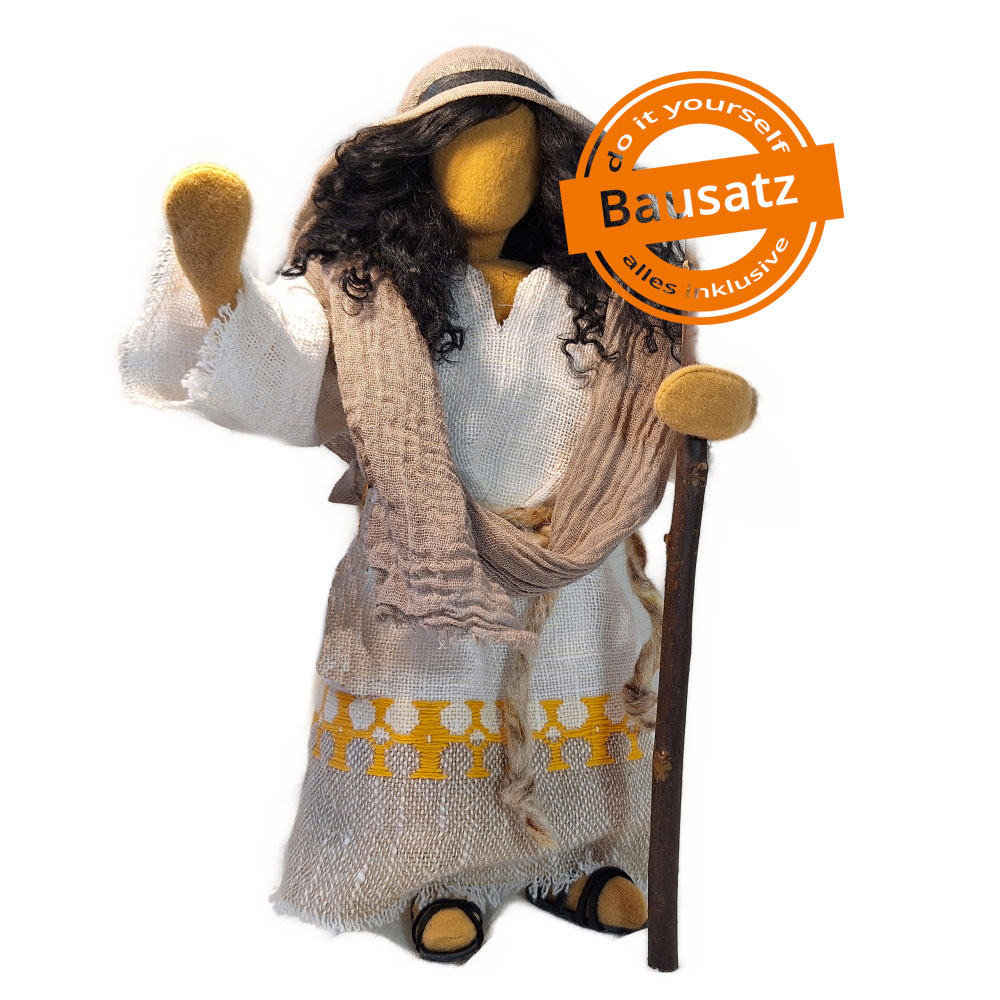 Du erhältst das Arbeitsmaterial, um den Jesus im besonderen Kleid herzustellen. Das fertig genähte Kleid sowie die Ledersandalen gehören mit zu diesem Bausatz.