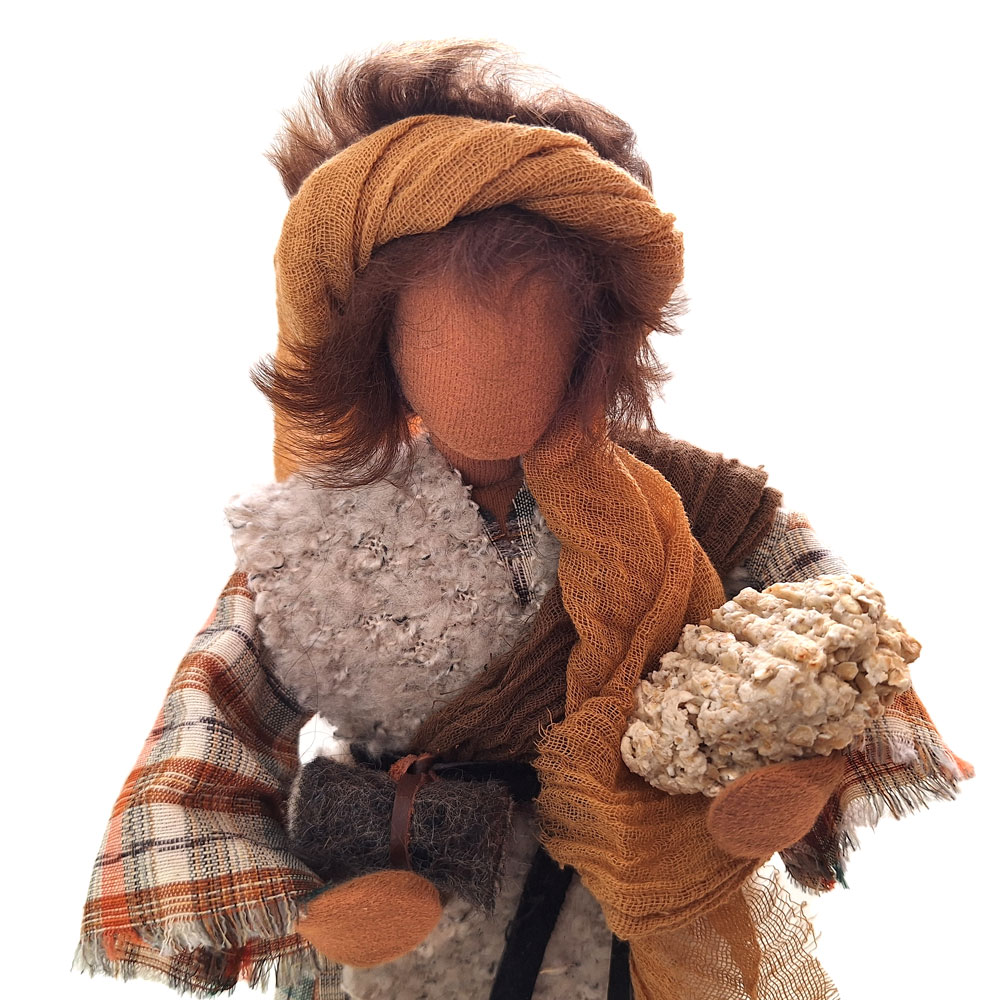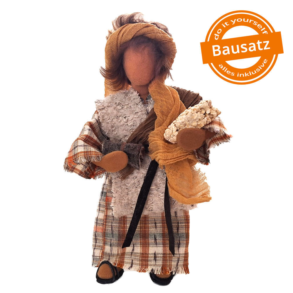 Du bekommst das Arbeitsmaterial sowie die Kleidung und das Brot, um diesen jungen Mann im Teenageralter in Eigenleistung herstellen zu können. Sareb hat von seiner Mutter einen Laib Brot bekommen. Den bringt er jetzt ins Nachbardorf zu seiner Großmutter.
