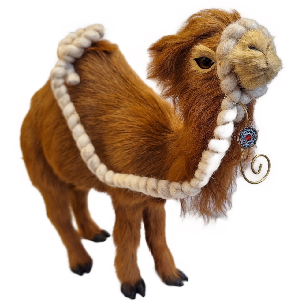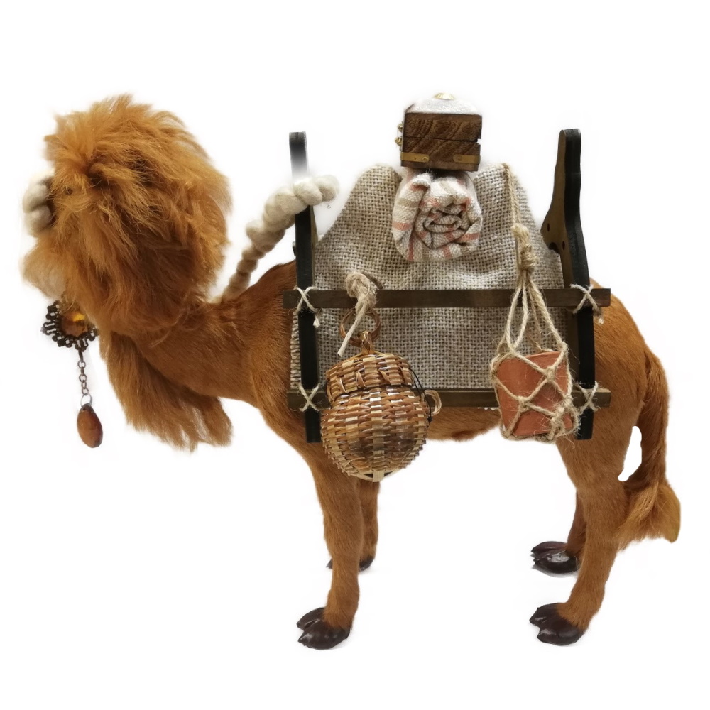 Hier siehst du das einhöckrige Kamel. Es ist etwas zierlicher und niedriger als das zweihöckrige.Die genauen Maße: 33cm hoch - 40cm langWir geben viel Herzblut in die Beladungen unserer Tiere. Jedes Tier ist ein absolutes Einzelstück, weil wir uns immer neue Kreationen einfallen lassen.Zuerst kommt ein geknüpfter Gurt rund um den Bauch. An diesem Gurt sind mindestens zehn Gepäckstücke angebracht. Neben Körben und Tonwaren gibt es die ein oder andere Besonderheit und immer eine Schatzkiste. Eine Trense ist an jedem Kamel befestigt und eine Glocke klingelt sanft, damit man das Tier auch hört, wenn es sich von der Herde gelöst oder in einem Sandsturm verirrt hat. Die Bilder sind Symbolbilder. Alle abgebildeten Tiere haben schon einen neuen Besitzer gefunden. Es ist aber jedes andere Tier genauso schön und prächtig ausgestattet.
