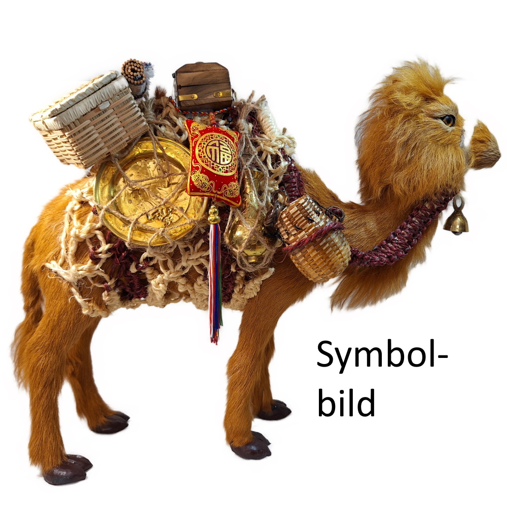 Hier siehst du das einhöckrige Kamel. Es ist etwas zierlicher und niedriger als das zweihöckrige.Die genauen Maße: 33cm hoch - 40cm langWir geben viel Herzblut in die Beladungen unserer Tiere. Jedes Tier ist ein absolutes Einzelstück, weil wir uns immer neue Kreationen einfallen lassen.Zuerst kommt ein geknüpfter Gurt rund um den Bauch. An diesem Gurt sind mindestens zehn Gepäckstücke angebracht. Neben Körben und Tonwaren gibt es die ein oder andere Besonderheit und immer eine Schatzkiste. Eine Trense ist an jedem Kamel befestigt und eine Glocke klingelt sanft, damit man das Tier auch hört, wenn es sich von der Herde gelöst oder in einem Sandsturm verirrt hat. Die Bilder sind Symbolbilder. Alle abgebildeten Tiere haben schon einen neuen Besitzer gefunden. Es ist aber jedes andere Tier genauso schön und prächtig ausgestattet.