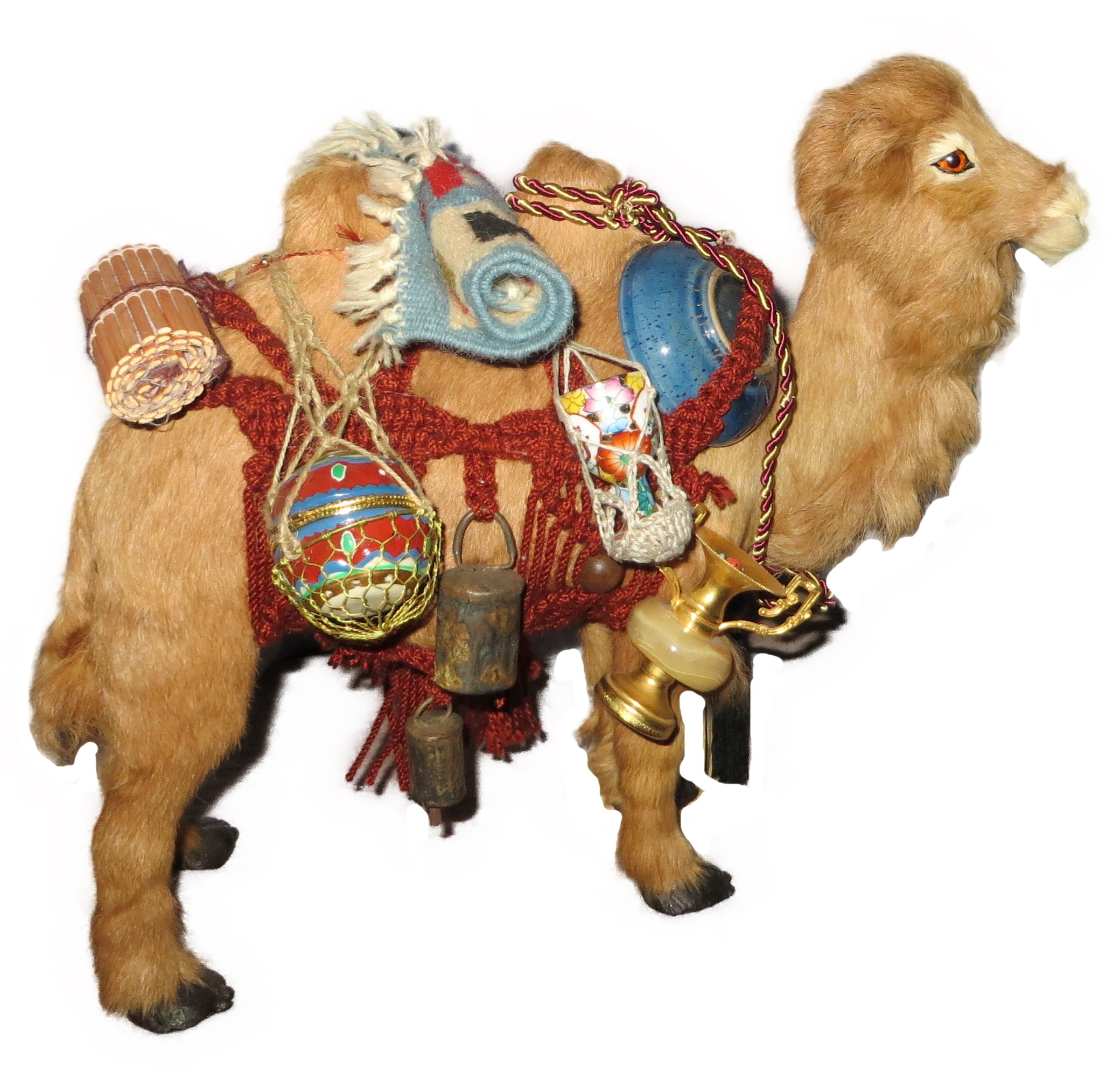 Wir knüpfen zuerst einen Gurt rund um den Bauch und befestigen daran mindestens zehn Gepäckstücke. Tonwaren und Körbe gehören zur Ladung, aber auch die ein oder andere Besonderheit im geflochtenen Netz und immer eine SchatzkisteImmer ist eine Trense am Tier befestigt und eine Glocke läutet sanft, damit man das Kamel auch hört, wenn es sich von der Herde löst oder sich während eines Sandsturms verlaufen hat.