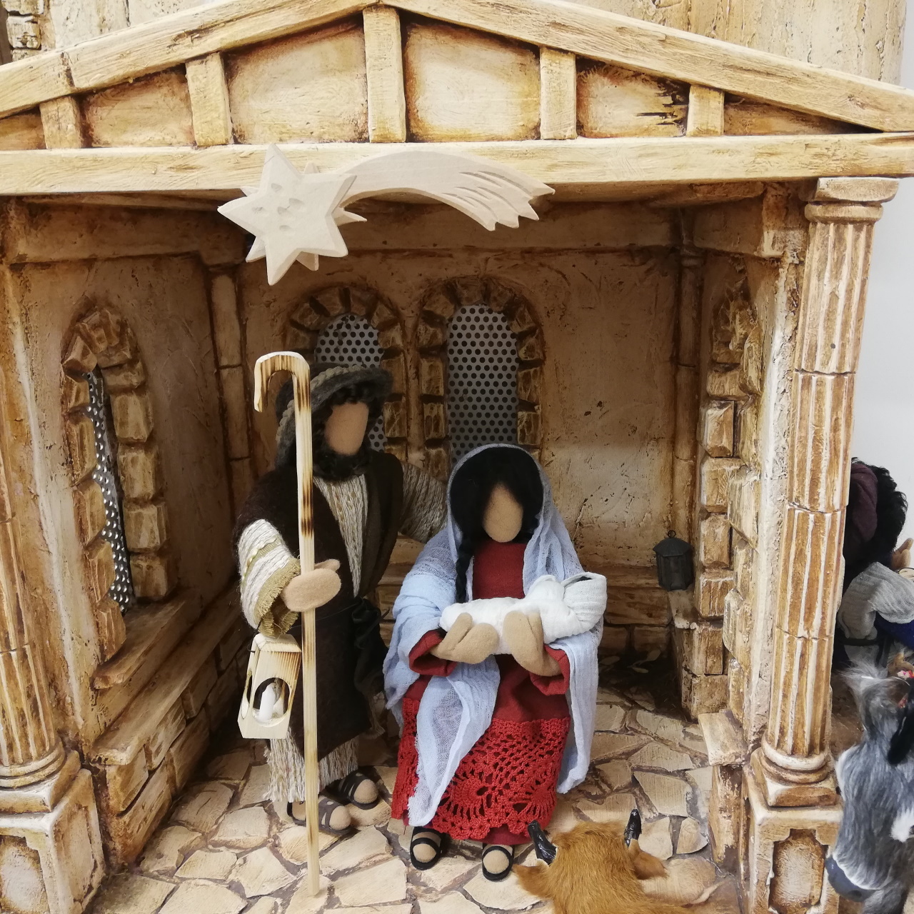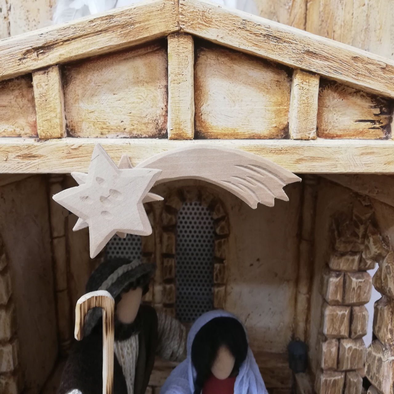 Der großer Krippenstall wird extra für unsere Figuren in einer deutschen Tischlerei von Hand angefertigt.Sie bietet Platz für die Heilige Familie, einen Hirten, Ochs und Esel, Schafe und...* Grundplatte 80 cm breit, 40 cm tief, Höhe 45 cm* Gefertigt zu 100 % in einer deutschen Meisterwerkstatt* Jeder Balken, jede Schindel einzeln gesägt, gebohrt, genagelt, geflämmt* Stabil auf der Grundplatte befestigt* Viele liebevolle Details, die in Einzelheiten voneinander abweichen können: Das Stroh zwischen den Balken, das gemauerte Seitenteil, die handgeschnitzten Balken, das schön gedeckte Dach... Die Krippe ist beliebig seitwärts erweiterbar. Mit Schachteln bauen Sie eine hügelige Landschaft, decken mit Gaze ab und schon können auch die Hirten am Lagerfeuer, die Heiligen Drei Könige, Kinder, Tiere und viele mehr am Weihnachtsgeschehen teilhaben.Beim Transport können kleine Holzlatten oder eine Schindel abgehen. Die befestigst du dann bitte einfach wieder mit Heißkleber oder einem Nagel. Dankeschön!