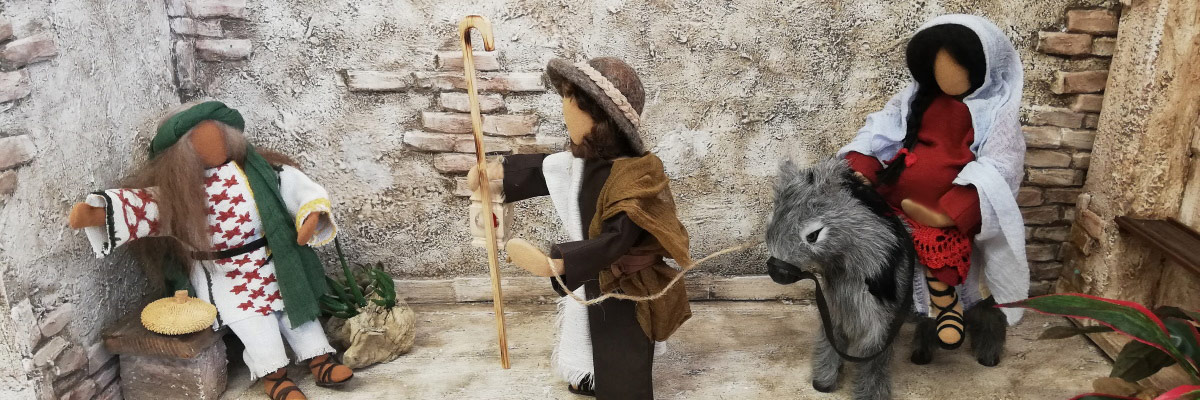 Maria ist in blau-rot gekleidet. Sie trägt liebevoll ihr Kind im Arm. Das Jesuskind ist aufwändig mit Händchen gefertigt. Die kann es ablegen oder der Mutter freudig entgegenstrecken. Josef passt farblich zur Maria. Er trägt einen handgefilzten Hut sowie eine im Inland handgefertigte Laterne und einen geschnitzten Stab.