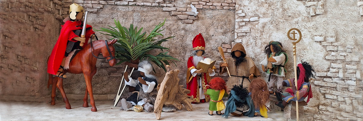 Zusammen mit dem Nikolaus und der Heiligen Familie ist St. Martin die meistgeliebte KOLB-Erzählfigur. Die Geschichten rund um St. Martin sind äußerst beliebt in den Kindergärten und mit Unterstützung unserer tollen Figur noch viel mehr. Die Kinder kommen ins Schwärmen wenn sie feststellen, dass St. Martins Mantel wirklich teilbar ist und sie sind verrückt nach dem coolen Helm und dem Holzschwert. Wenn St. Martin von seinem Ross steigt, das Schwert aus der Scheide zieht und den Mantel teilt, um dann den Bettler damit zuzudecken, ist es muxmäuschenstill in der Kinderrunde. Die Münder sind zugeklappt und die Augen strahlen. Das ist so imposant für die Kinder, dass die meisten diese Bilder nie mehr vergessen und somit die Essenz der Geschichte vom Teilen und Güte gegenüber Schwächeren zeigen in den Kinderseelen gefestigt und ins Erwachsenenalter weitergetragen wird.Die Erwachsenen erfreuen sich zusätzlich über die Handstiche in Martins Kleid und über die handwerklich schön gearbeiteten Einzelteile. Das Schwert ist extra kindgerecht gefertigt. Es ist aus einem Stück Holz gedrechselt und geschnitzt mit stark abgerundeter Spitze, damit sich kein Kind damit verletzen kann. Um das Schwert höchst stabil zu machen, hat es eine sehr dicke Schneide, was es bei normalem Gebrauch unkaputtbar macht.