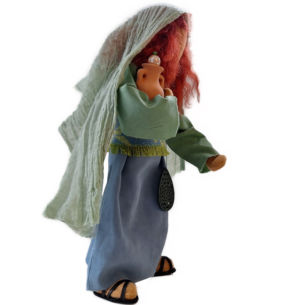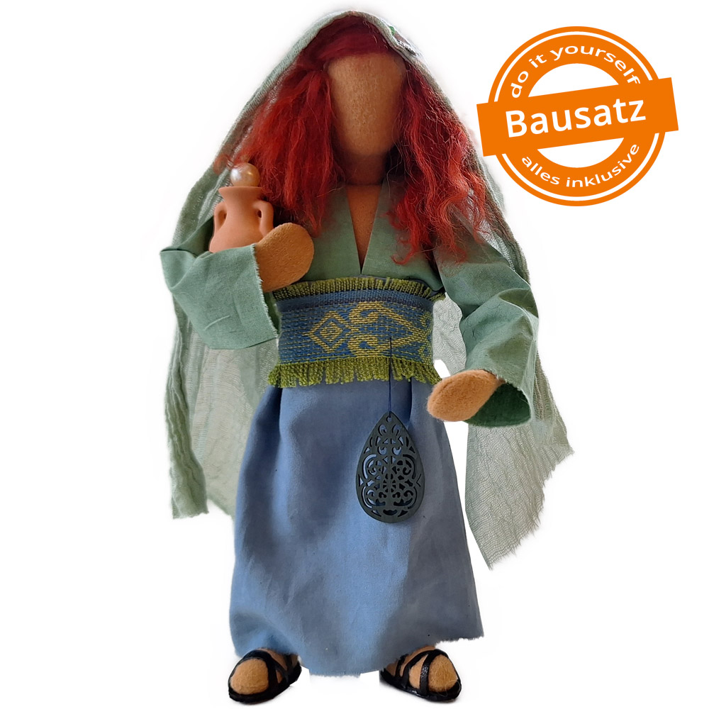 Deborah ist wie Lydia eine der ganz, ganz wenigen Frauen, die zur Zeit Jesu ein wichtiges Amt inne hatten und die Möglichkeit, über die Geschicke ihres Volkes mitzubestimmen. Sie war darüber hinaus auch Prophetin und sicherlich hat sie Wichtiges und Gutes in ihrem Leben bewirkt.Als Zeichen Ihrer Würde hält sie einen besonderen Stab aus Holz - in verschiedenen Ausführungen und sehr schön gefertigt - in der Hand.Auch trägt sie ein sehr besonderes Schmuckstück um den Hals. Es handelt sich um einen handgefertigten Anhänger mit Schmuckstein aus Pakistan. Jeder ist ein Unikat und hat eine andere Form und Farbe. Dieser Schmuckanhänger ist ein Sozialprojekt: Ich habe mit einem pakistanischen Freund ein kleines Hilfsprojekt gestartet. Er gibt jeder Frau, die ihm ein solches altes Schmuckstück bringt 7 Euro, was für dortige Verhältnisse krass überbezahlt ist. So helfen wir den Frauen, ohne ihnen ein Gefühl von Almosenverteilung zu geben, und dafür kannst du und ich Freude empfinden an der Authentizität eines jeden Anhängers.