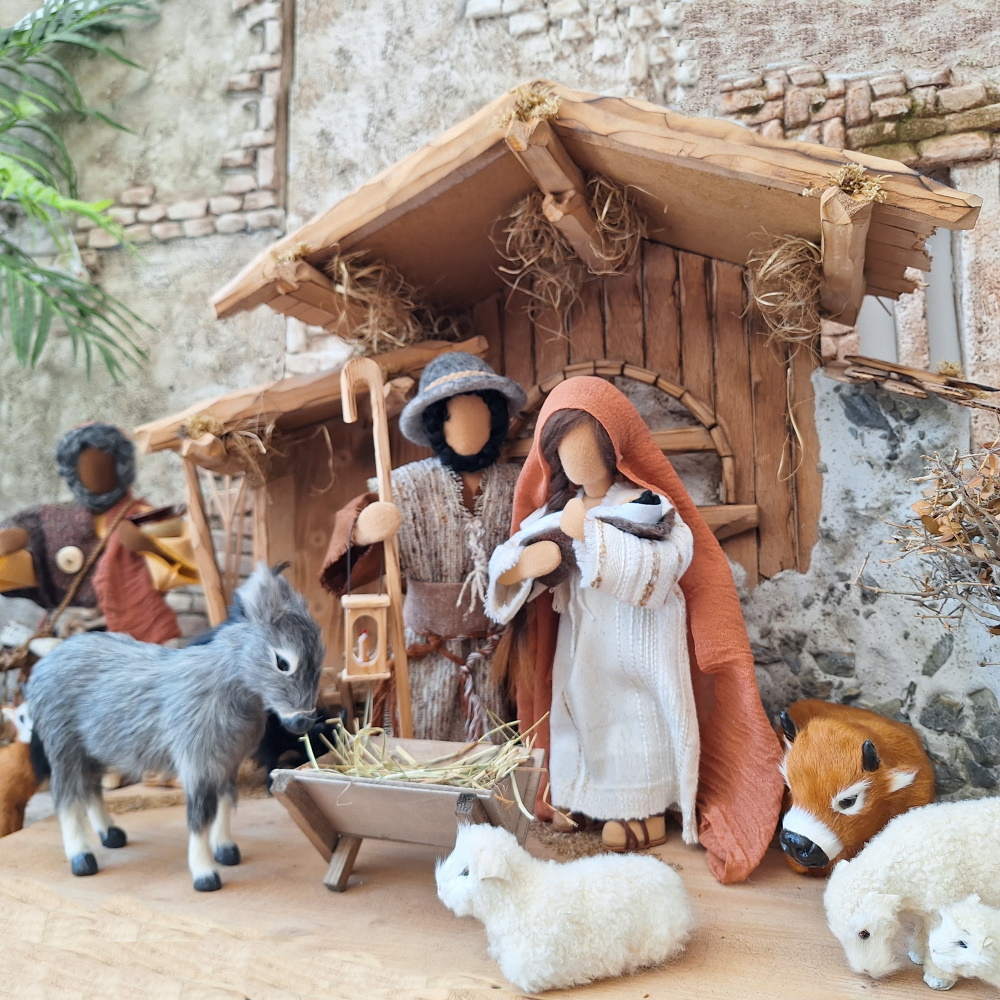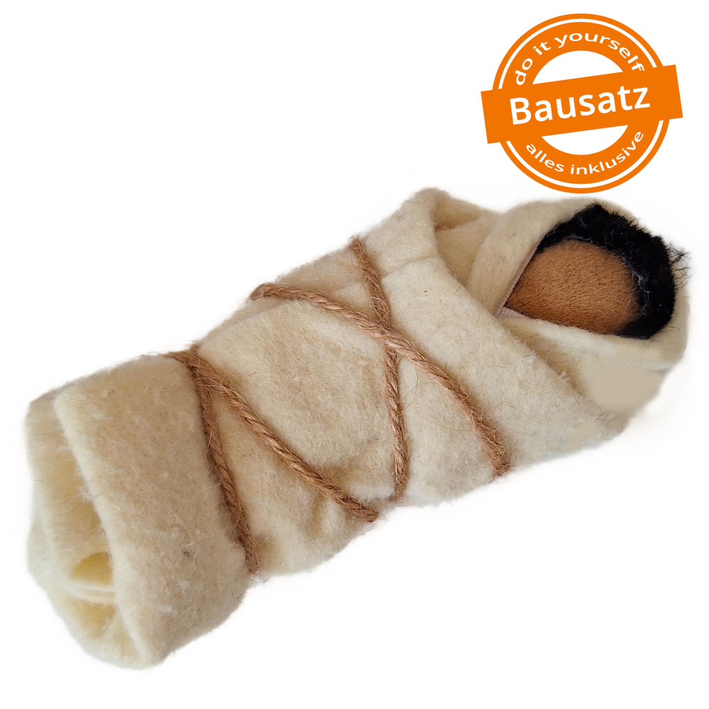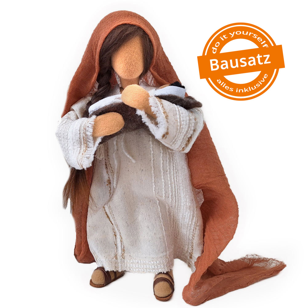 Du erhältst das Arbeitsmaterial, um Maria in Naturtönen mit ihrem Kind anzufertigen. Das Baby ist schlicht gefertigt. Man sieht nur das Köpfchen und die Windel ist gewickelt, nicht genäht.