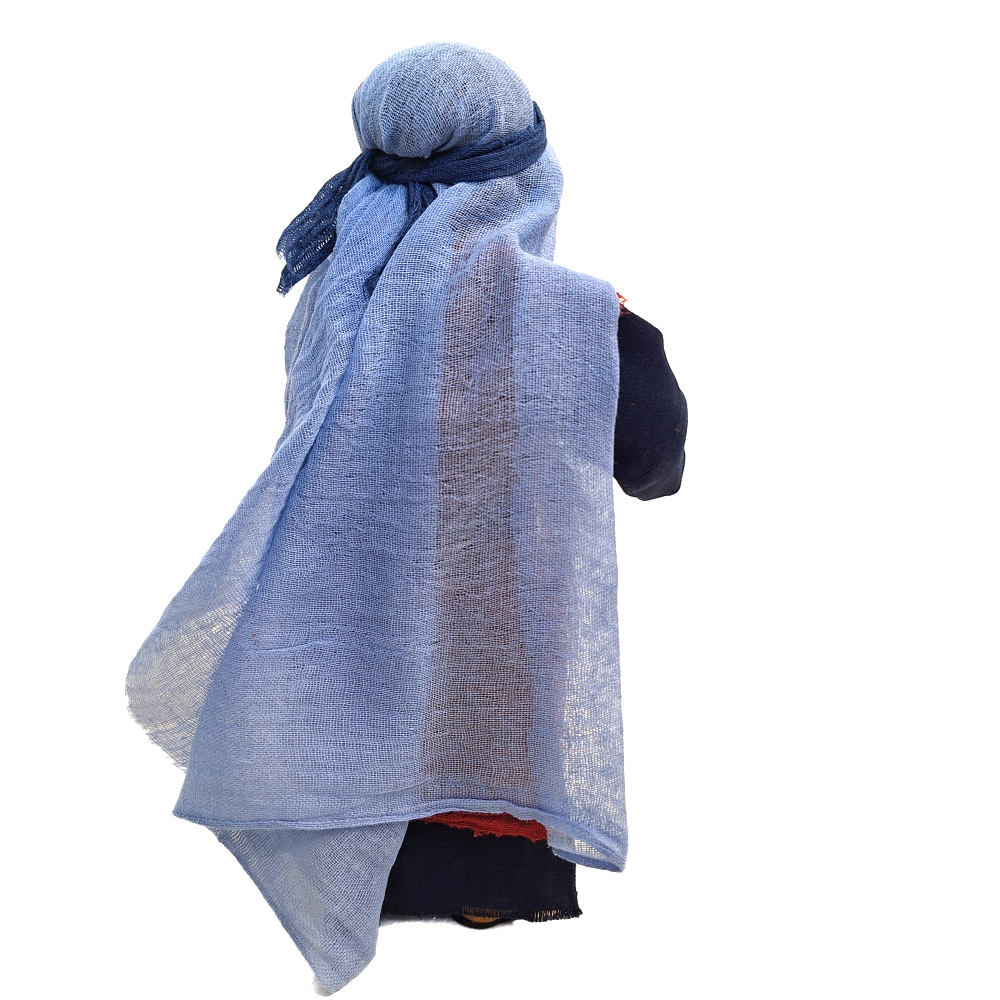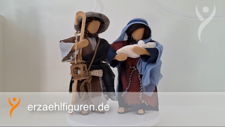 Maria ist in blau-rot gekleidet und hält voller Liebe ihr Baby im Arm. Das Kindlein ist so gefertigt, dass man nur das Köpfchen aus der Windel herauslugen sieht.