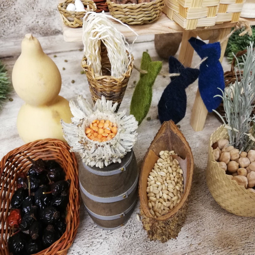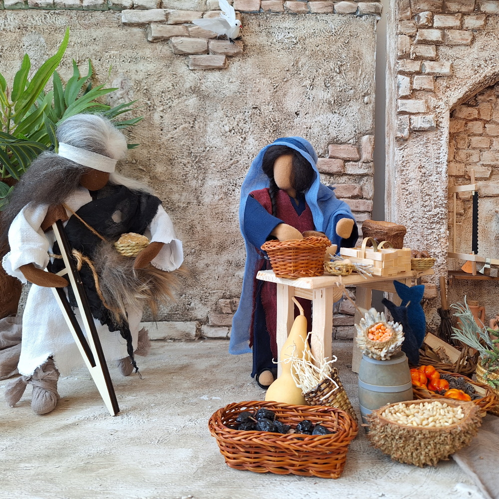 Die Geschichte Rut erzählt vom Fremd sein und Heimisch werden. Sie reist mit ihrer Schwiegermutter Noomi - beide verwitwet - nach Bethlehem, wo sie Boas kennen lernt. Beide Frauen bemühen sich, dass er Rut heiratet, denn nur so sind sie sicher und auf Dauer überlebensfähig.Unsere Rut trägt ein bequemes Reisekleid mit großem Schleiertuch, um sich für die Reise gut bedecken zu können. Sie hat drei Körbe mit dabei, in denen sie ihre Habseligkeiten verstauen kann.