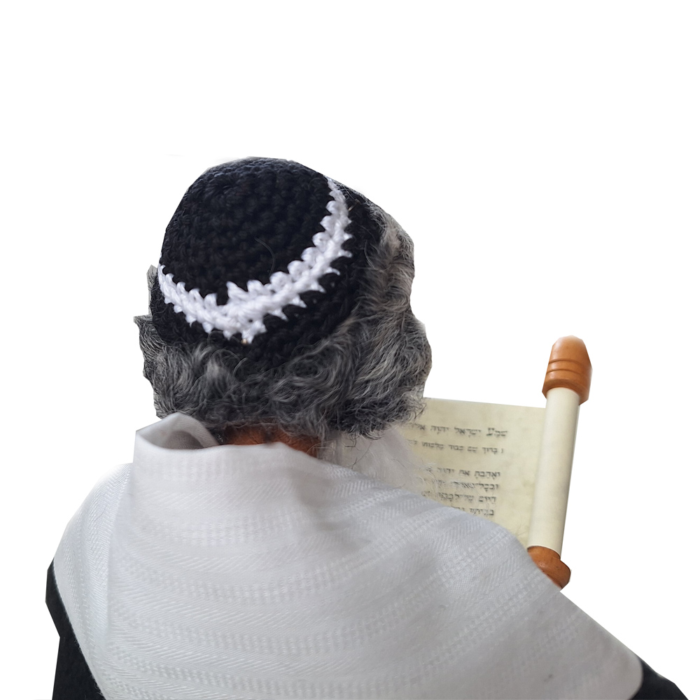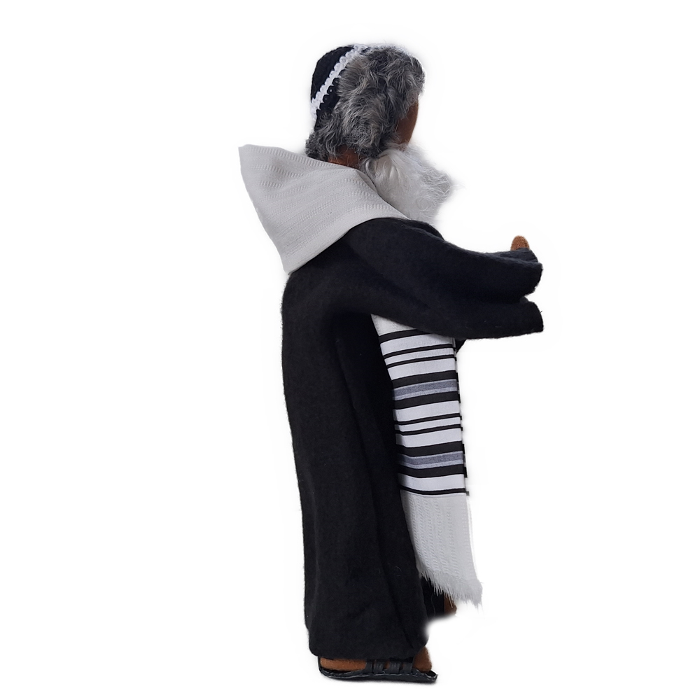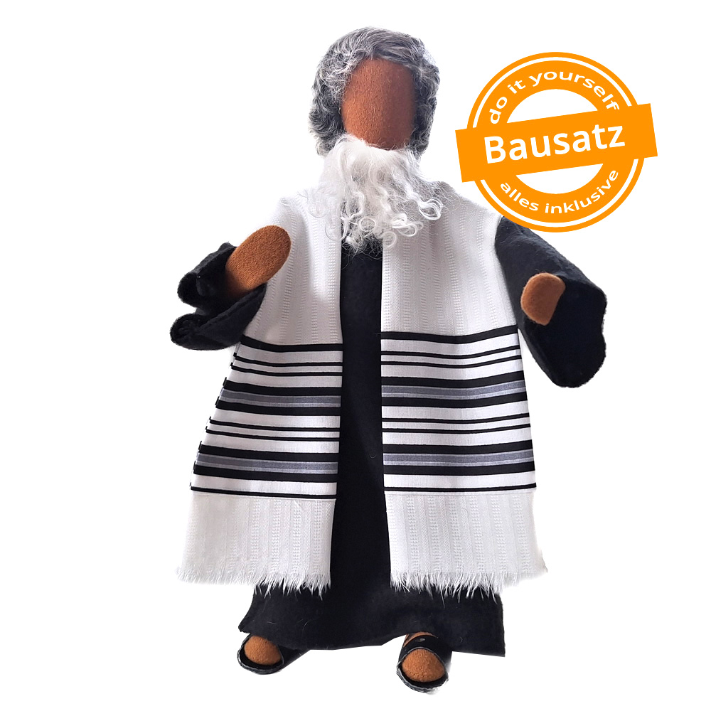 Du erhältst das Arbeitsmaterial und das schöne Kostüm mitsamt der handgehäkelten Kippa und des Tallith für den Propheten sowie seine Lederschuhe. Jüdische Priester und Propheten spielen in sehr vielen Bibelstellen wichtige Rollen. Unser Rabbiner trägt ein schwarzes Kleid, eine handgehäkelte Kippa bedeckt den Hinterkopf und der gestreifte Tallith ist in schwarz-weiß gehalten, wie es Sitte ist. Wenn du unsere wunderschöne Thorarolle mit fussgedrechselten Haltegriffen und  hebräischem Originaltext auf Papyrus haben möchtest, bestelle sie bitte dazu.