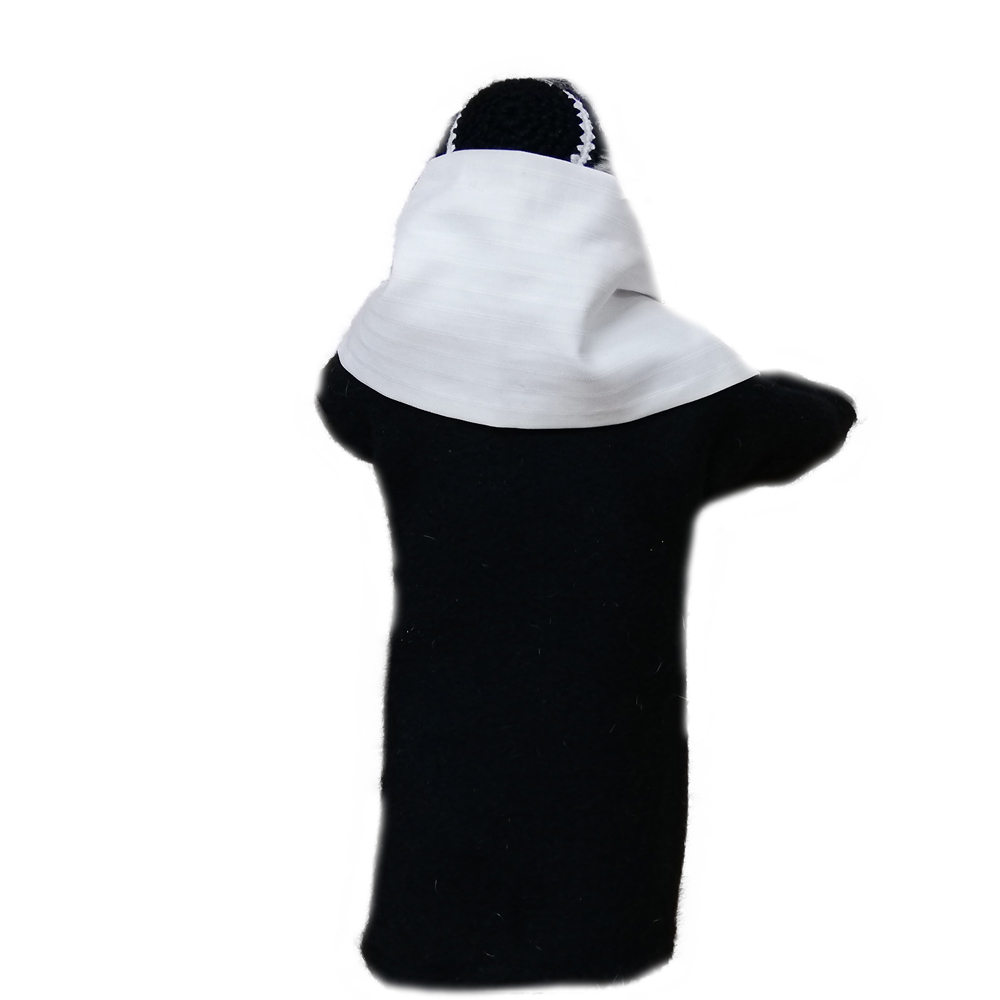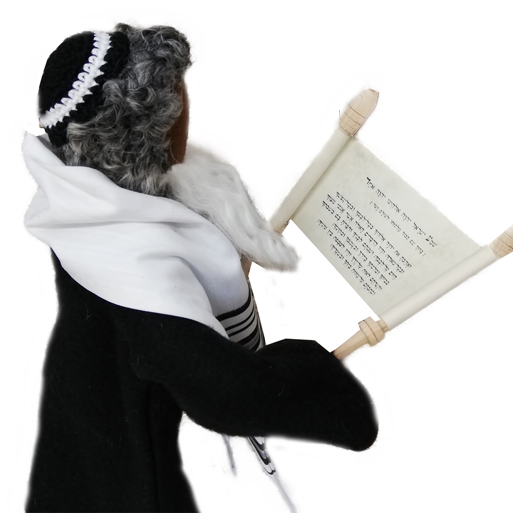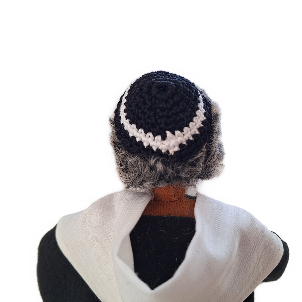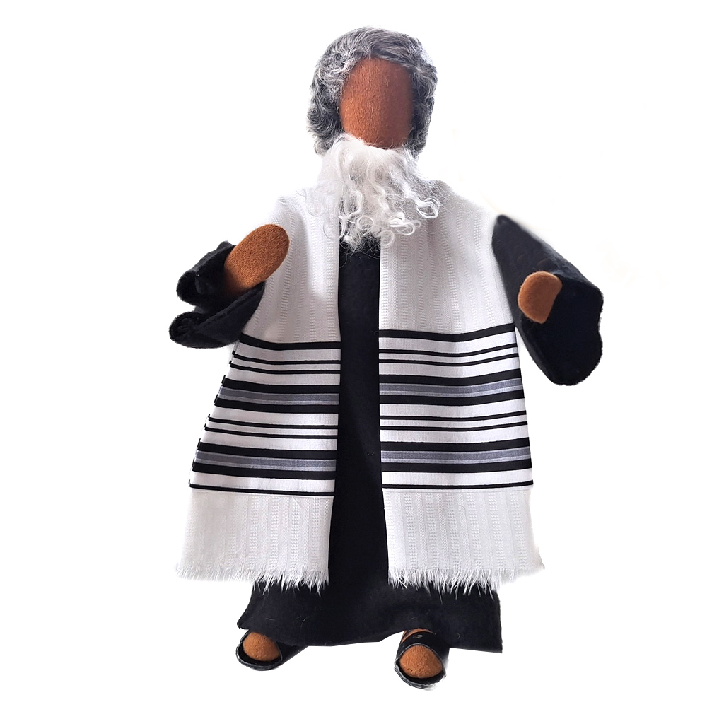 Du erhältst das Arbeitsmaterial und das schöne Kostüm mitsamt der handgehäkelten Kippa und des Tallith für den Propheten sowie seine Lederschuhe. Jüdische Priester und Propheten spielen in sehr vielen Bibelstellen wichtige Rollen. Unser Rabbiner trägt ein schwarzes Kleid, eine handgehäkelte Kippa bedeckt den Hinterkopf und der gestreifte Tallith ist in schwarz-weiß gehalten, wie es Sitte ist. Wenn du unsere wunderschöne Thorarolle mit fussgedrechselten Haltegriffen und  hebräischem Originaltext auf Papyrus haben möchtest, bestelle sie bitte dazu.