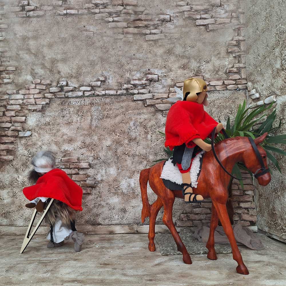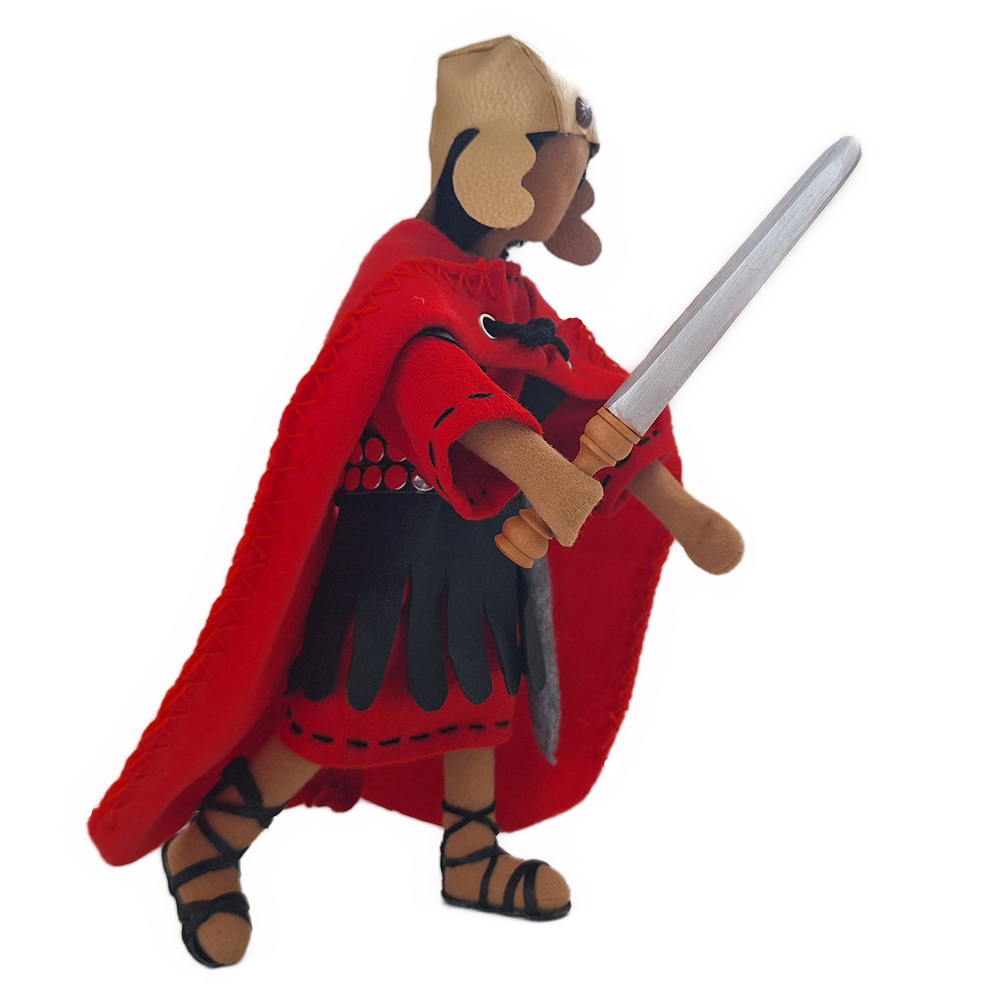 Der römische Soldat ist eine besondere Charakterfigur. Ich frage mich immer, was die oft sehr unschönen Handlungen und Taten sowie das Gehorchen müssen mit einem Soldaten machen. Sicherlich wird da mancher innerer Konflikt ausgetragen. Und sicherlich gibt es auch manch lichtvollen Gottesfunken ins Herz, um ein Umdenken in der Seele zu bewirken.Gerade auch aus diesen Gründen haben wir uns sehr liebevoll um die Gestaltung unserer Soldatenfigur gekümmert. Der handgenähte Helm sowie der Mantel gehören zur Grundausstattung. Alles weitere Zubehör kannst du je nach Wunsch separat dazu bestellen. Es sind dies ein handgefertigtes Holzschwert, ein Römerschild, ein Pilum = röm. Lanze sowie eine Geissel.