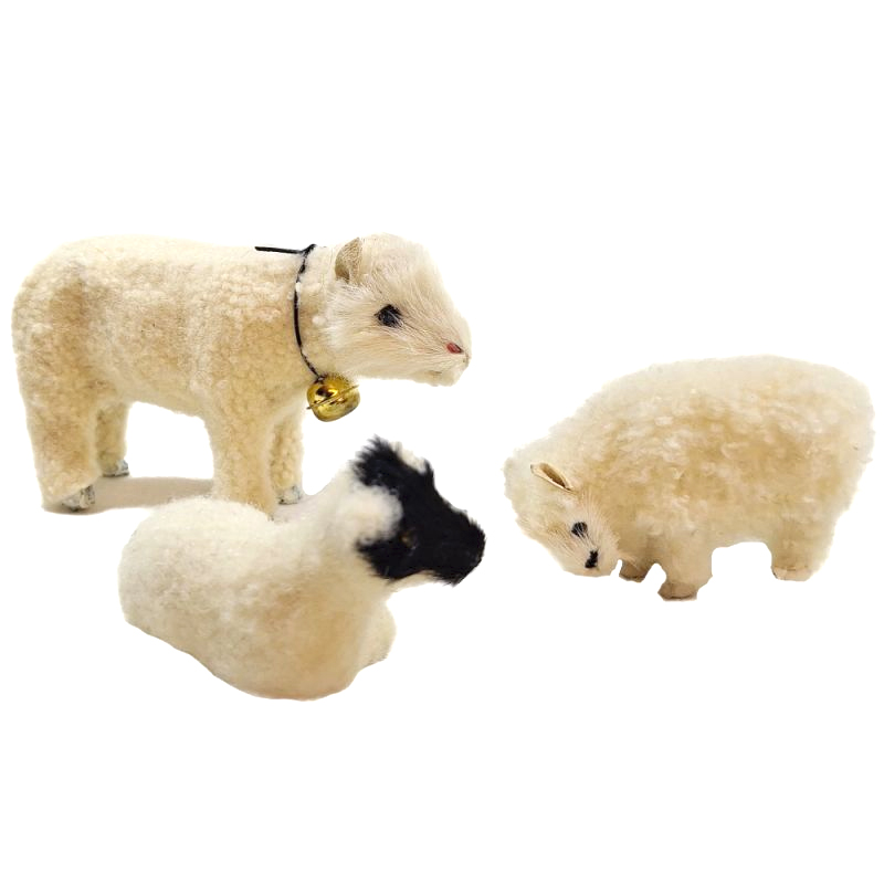 Das stehende Muttertier hat eine Glocke umgebunden, die zwei Lämmer nehmen unterschiedliche Körperhaltungen ein - je nach Vorrat.Das Schaf ist 12cm lang, die Lämmer je 9cm.Die Schafe und Lämmer aus der Felltierserie sind mit echtem Schaffell überzogen. Sie sind unbeweglich, aber in den Haltungen "stehend", "fressend" und "liegend" erhältlich. Sie passen in der Größe zu 25-30cm große Figuren und zum Ochsen, dem Esel und zum Kamel, den anderen Felltieren aus unserem Sortiment.