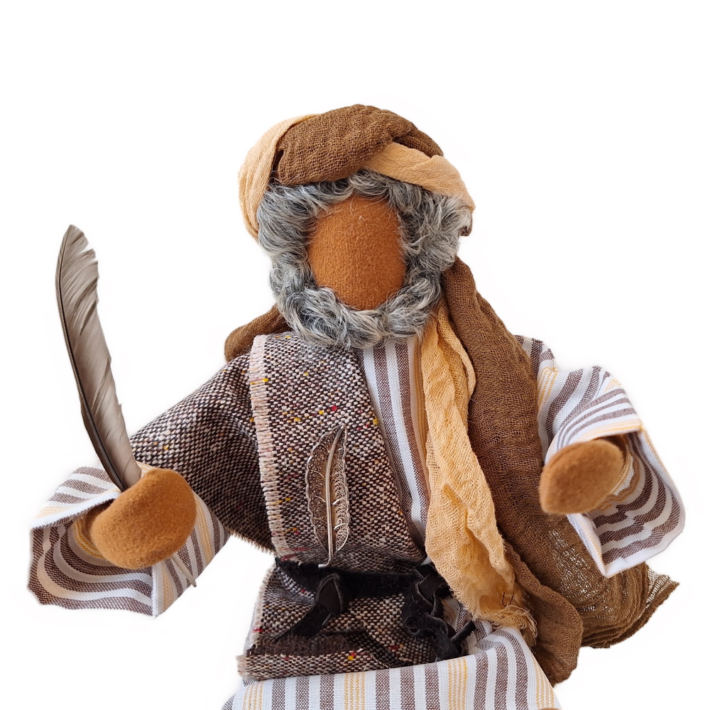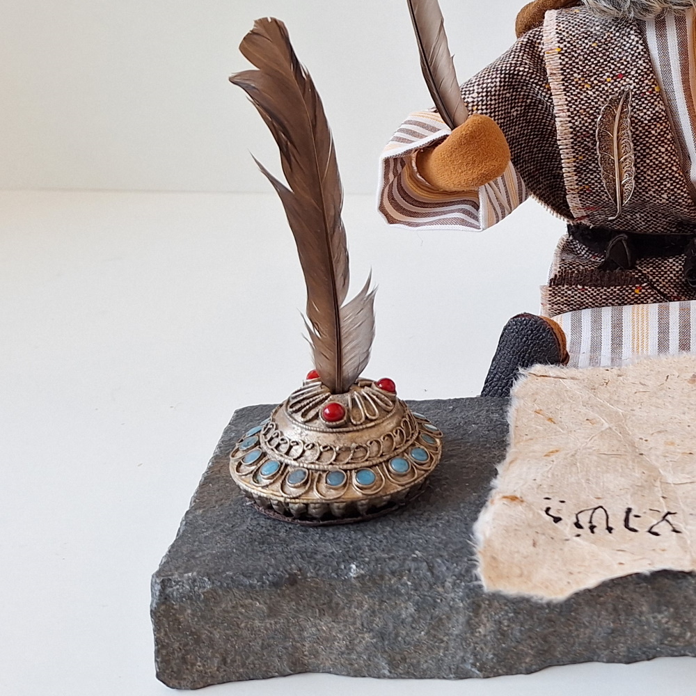 Der Schreiber Baruch sitzt vor seiner Schreibplatte aus Marmor. Er schreibt gerade an einem Auftrag.