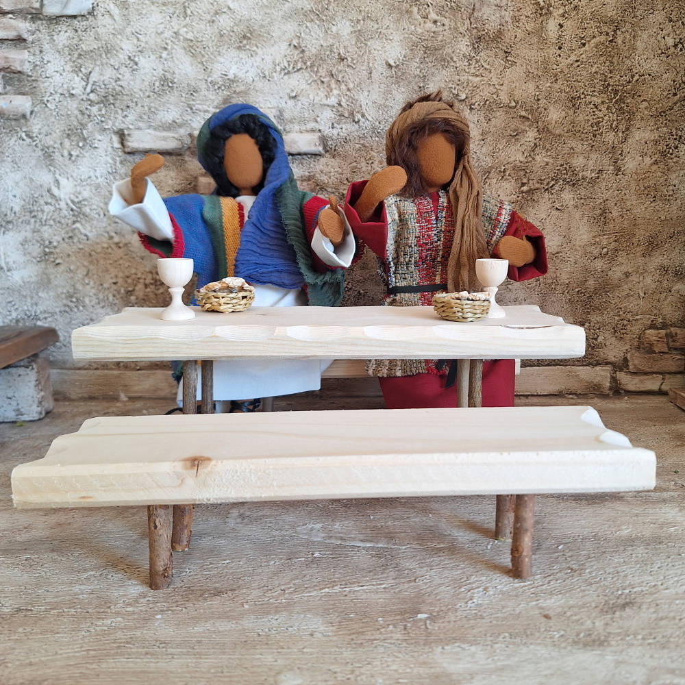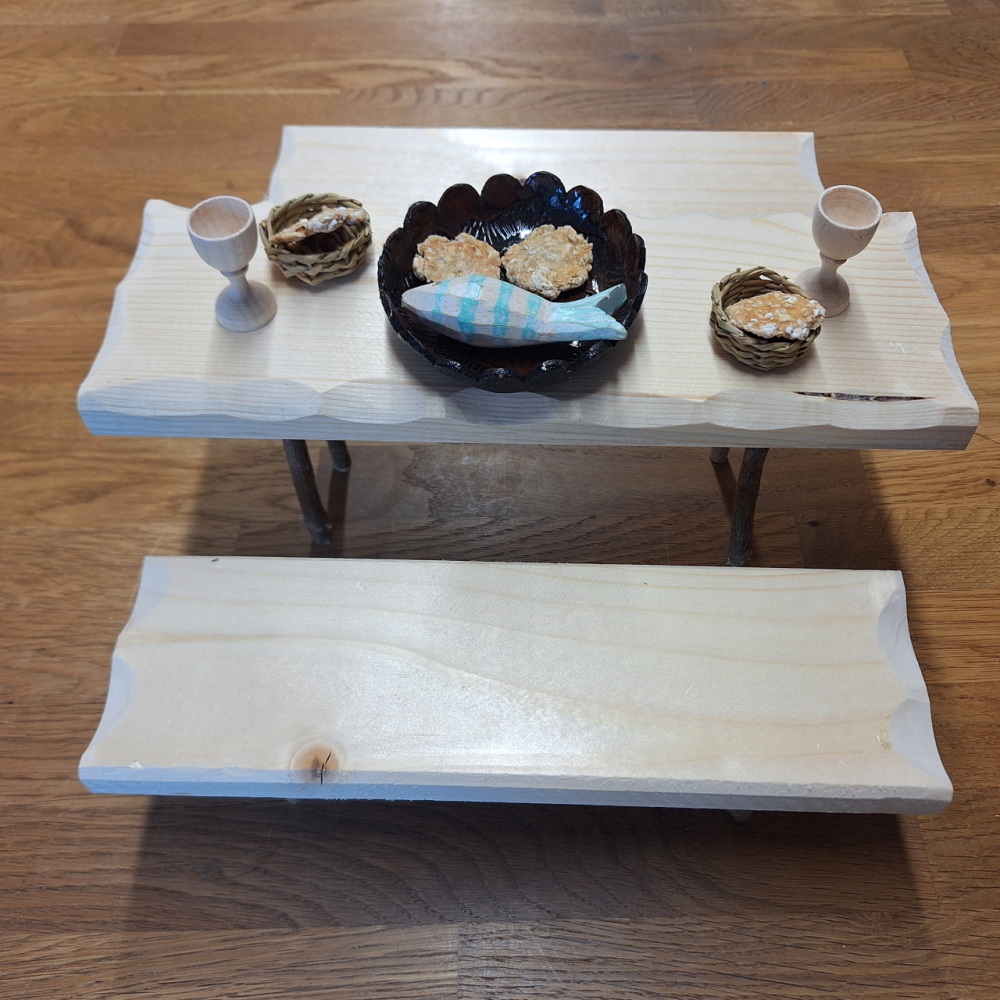 Massgeschneidert für unsere 30cm großen Erzählfiguren hat uns ein Schreiner diese Sitzgarnitur, bestehend aus einem Tisch und zwei Bänken. Die rundherum eingekerbten Platten sind aus heimischem Holz und die Beine von Tisch und Bänken sind aus Astmaterial gemacht, um ein rustikales Aussehen zu erreichen.