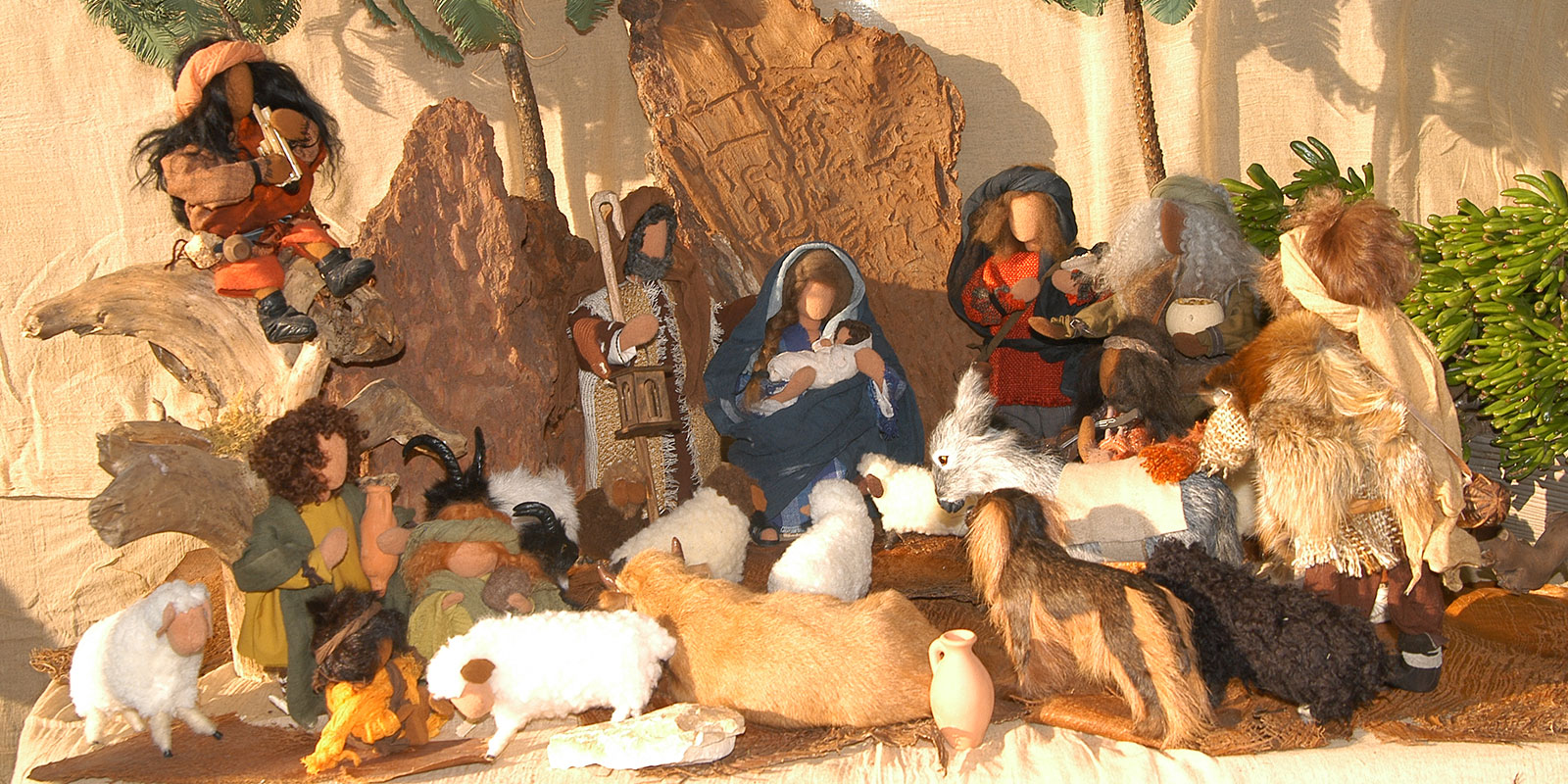 Maria ist in blau-rot gekleidet. Sie trägt liebevoll ihr Kind im Arm. Das Jesuskind ist aufwändig mit Händchen gefertigt. Die kann es ablegen oder der Mutter freudig entgegenstrecken. Josef passt farblich zur Maria. Er trägt einen handgefilzten Hut sowie eine im Inland handgefertigte Laterne und einen geschnitzten Stab.