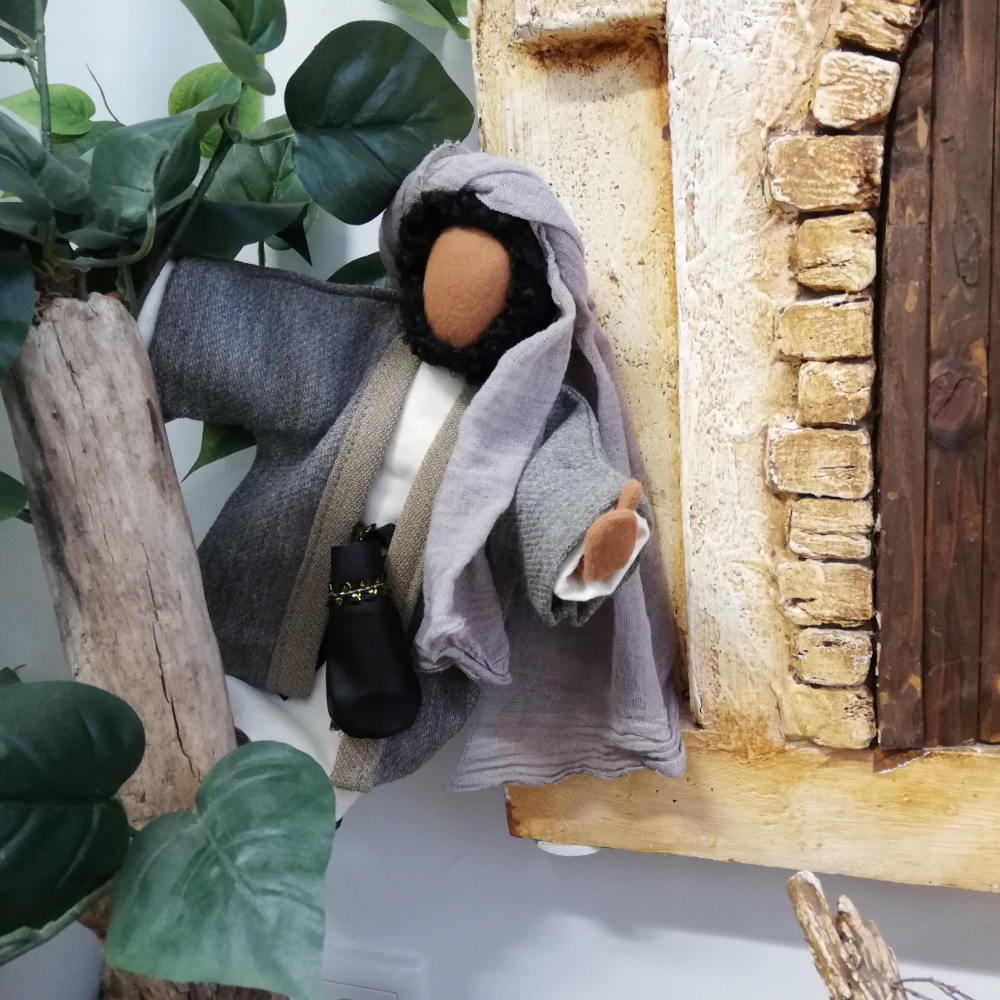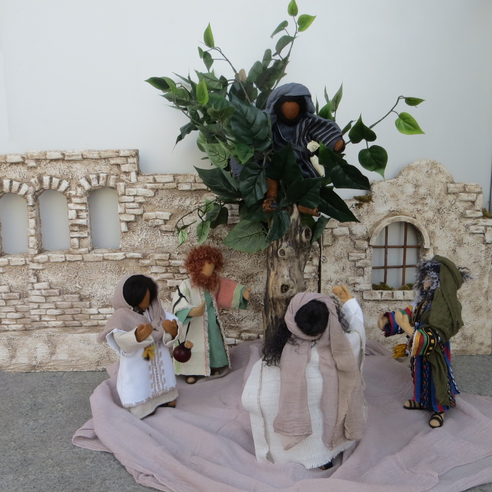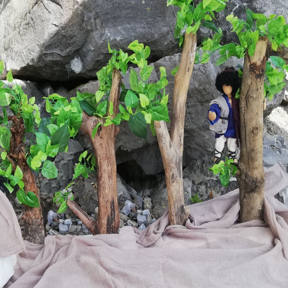 Ideal zum Erzählen der Geschichte von der Begegnung Jesu mit dem Zöllner Zachäus. Es ist die Geschichte von Erkenntnis gewinnen, Reue zeigen, Wiedergutmachung und göttlicher Vergebung. Aber natürlich spenden unsere schönen Bäume auch allen anderen Erzählfiguren Schatten.Jeder Baum ist ein Unikat. Unsere Chefin sammelt passende Schwemmholzäste am Bodensee, trägt sie ins Atelier, wäscht sie und schraubt sie auf eine Unterplatte, damit der Baum gut steht. Die Unterplatte wird mit Gazestoff abgedeckt, damit sich der Baum in jede Figurenlandschaft einfügt. Jeder Baumstamm ist so ausgewählt, dass er eine Astgabelung in passender Höhe hat.Das Kunstgrün bringen wir auf jedem Baumstamm individuell so an, dass eine schöne Krone entsteht, die aber nicht zu dicht ist, damit Zachäus gut gesehen wird, wenn er auf den Baum steigt. Die Äste sind gut biegsam, sodass sich der Baum den Begebenheiten anpassen kann.Ungefähre Baumhöhe 60cm