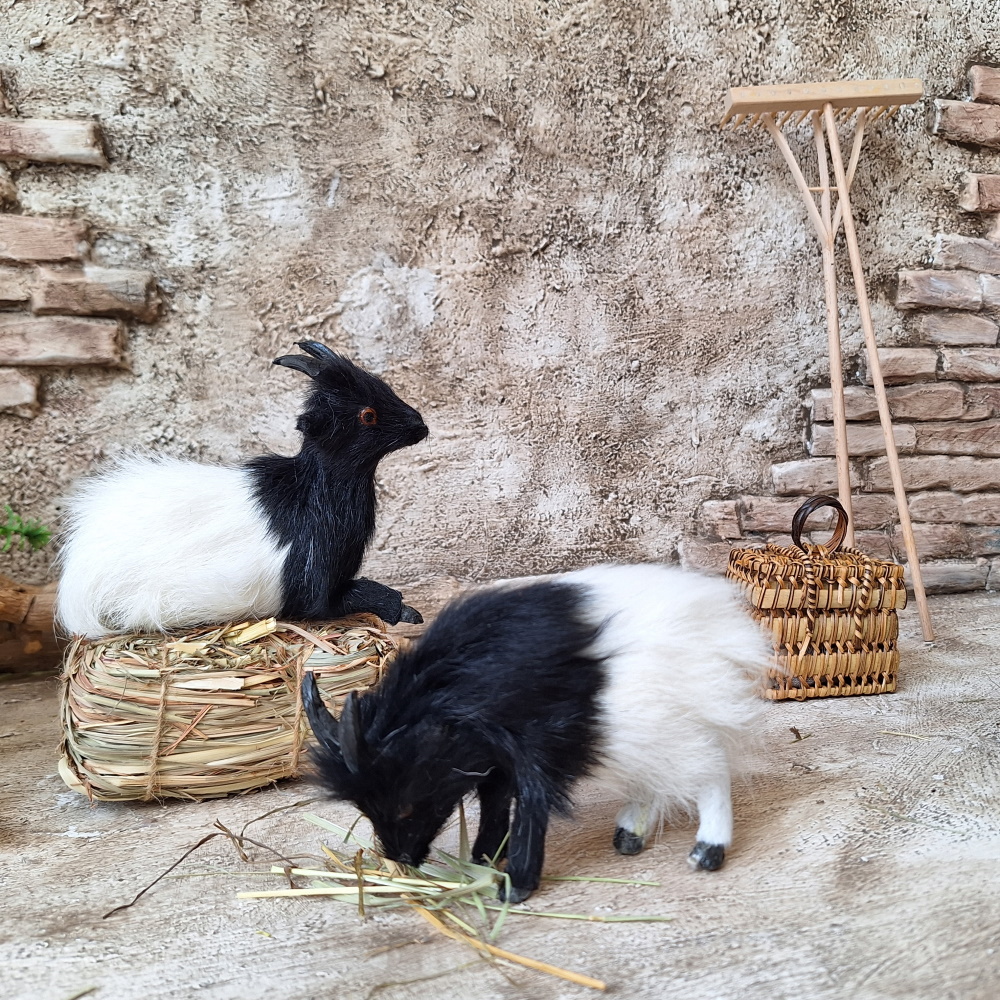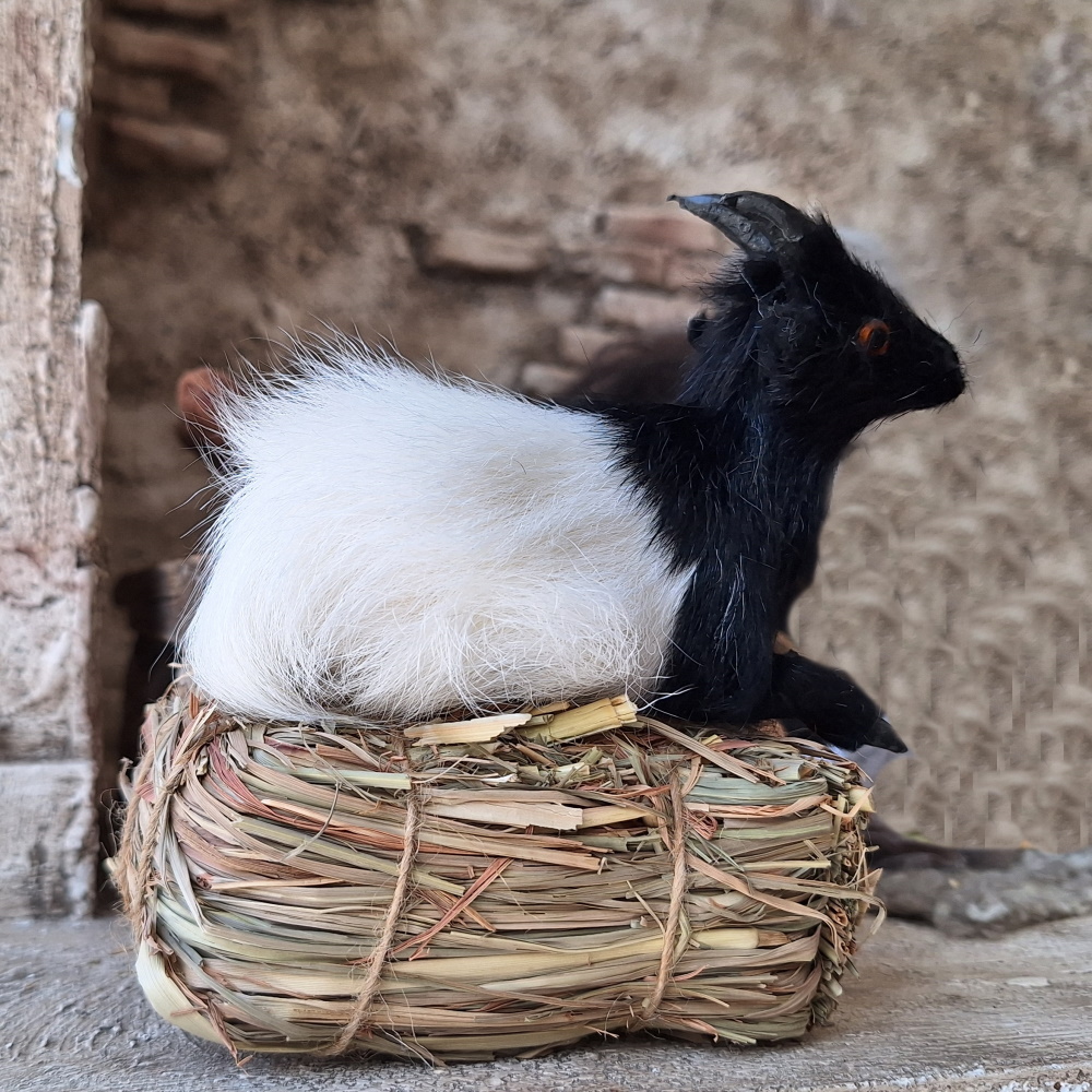 Die Ziegen sind sehr schön und detailgetreu aus Rinderfell gefertigt. Diese liegende Ziege hat gerade ein Kitz geboren.