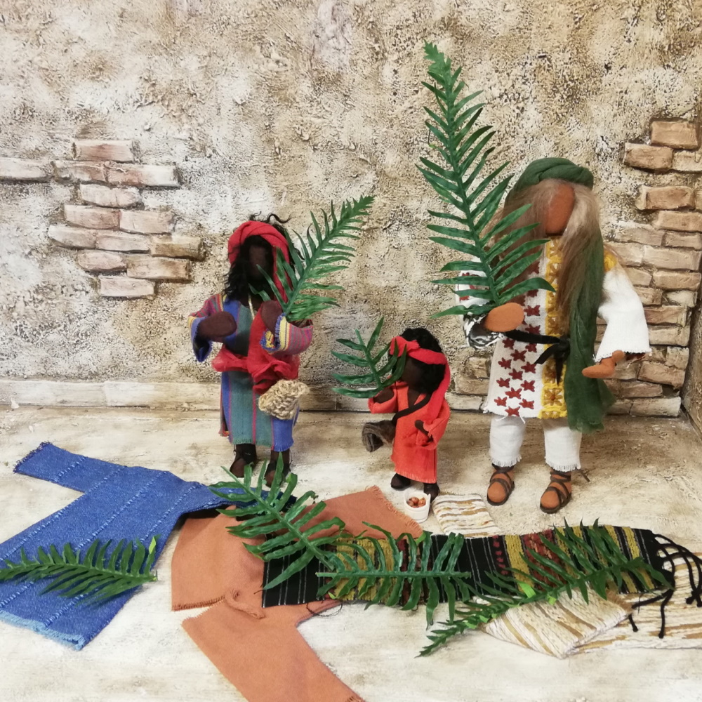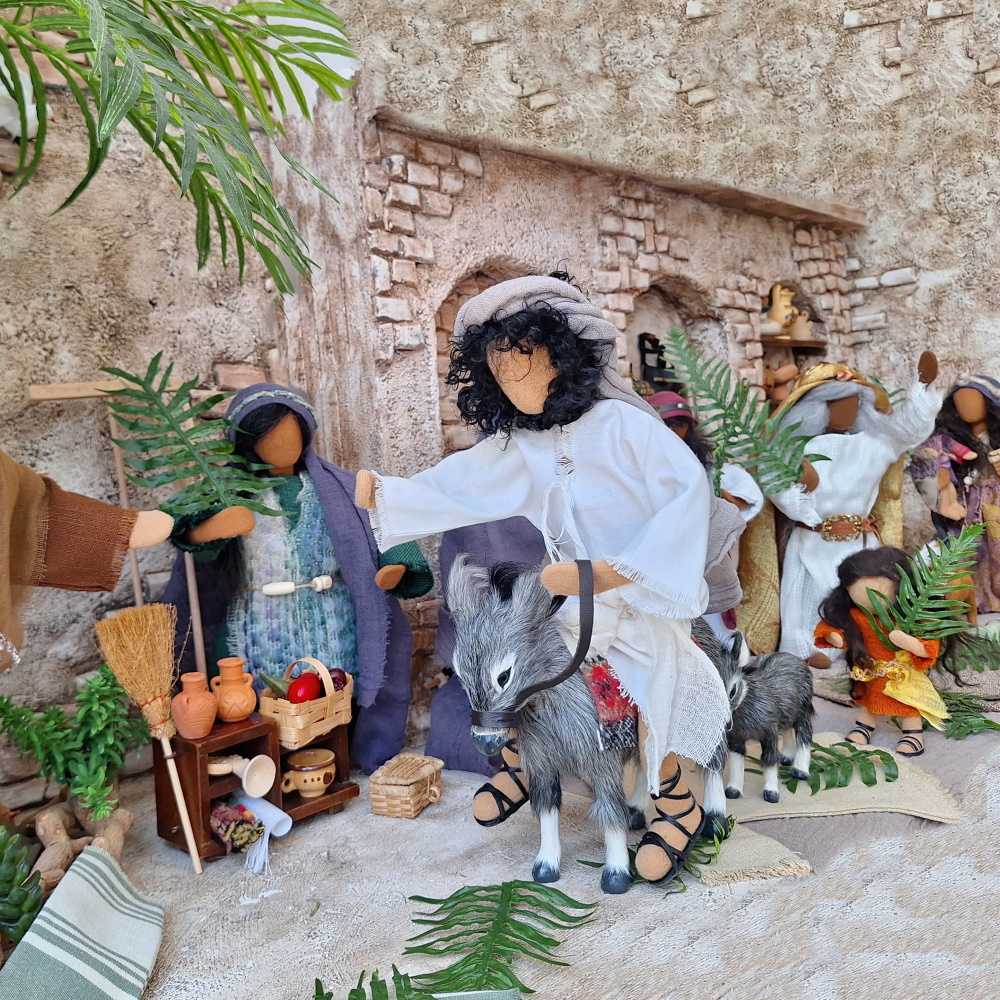 Veronika reicht Jesus auf dem Kreuzweg ein Tuch und wischt ihm den Schweiß von der Stirn. Sie ist schlicht gekleidet und in der Kreuzwegszene hat sie sich mit ihrem Tuch fest verhüllt.Darunter trägt sie aber einen Schmuckgürtel und eine tolle Haarspange. So kann sie zu vielenSzenen als Frau mittleren Alters verwendet werden.