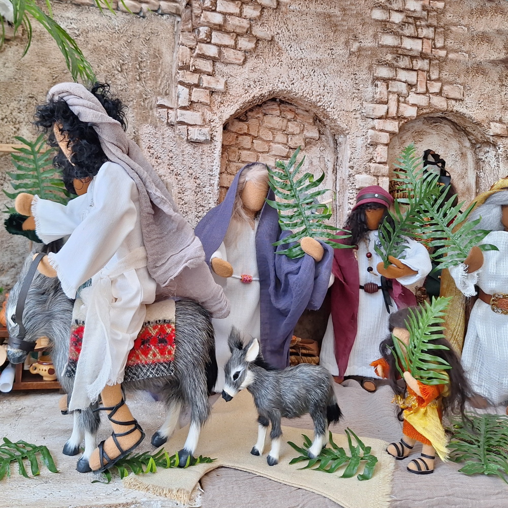 Jesus wirkt sehr schlicht in seinem hellen Kleid. Trotzdem gibt die Figur richtig etwas her. Das machen die schönen halblangen Haare und der pfiffige Ausschnitt. Die dunkle Ledertasche ergibt einen schönen Kontrast zur Helligkeit des Jesus.